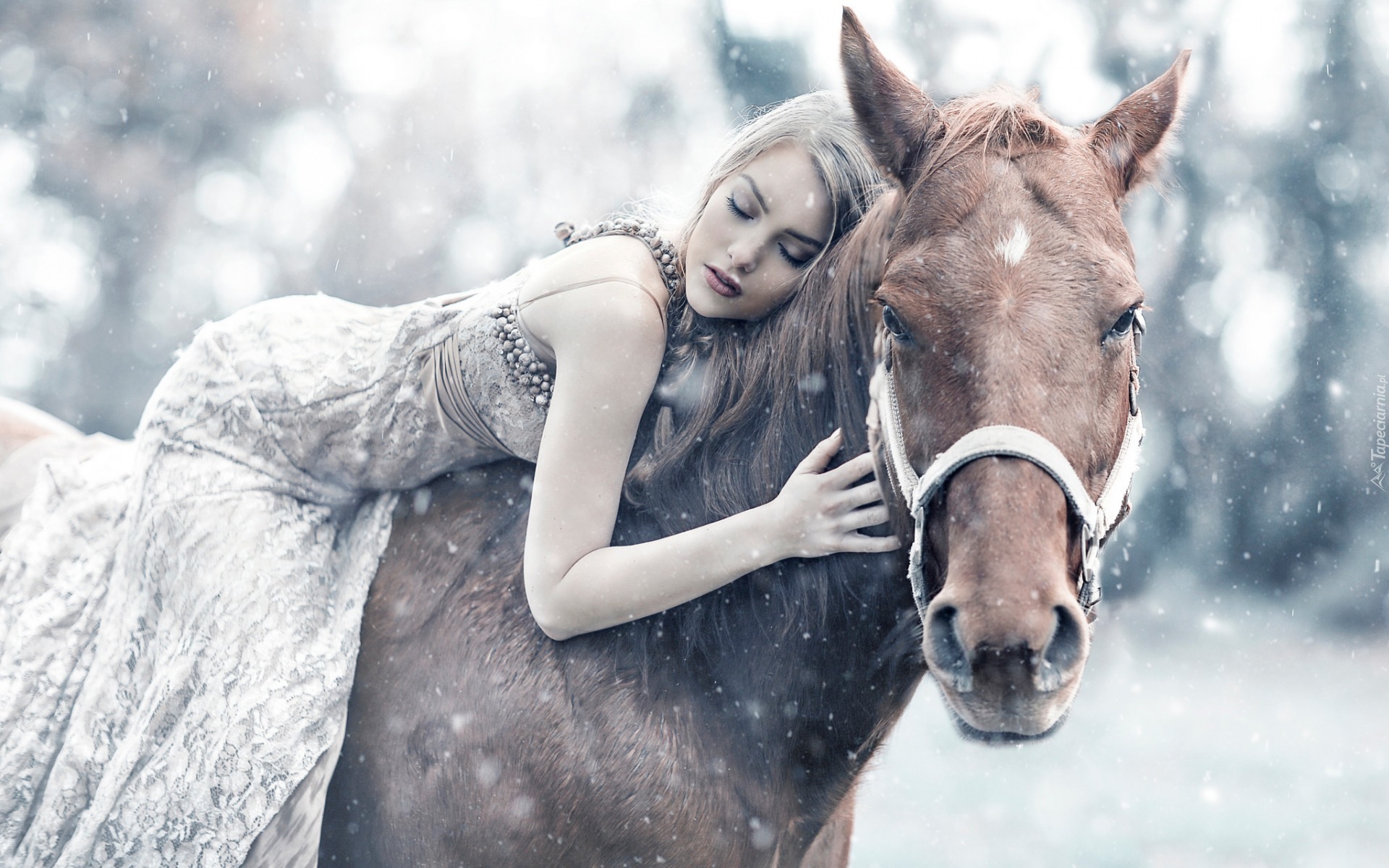 Edytor tapety: Kobieta w sukience na koniu w zimowym krajobrazie
