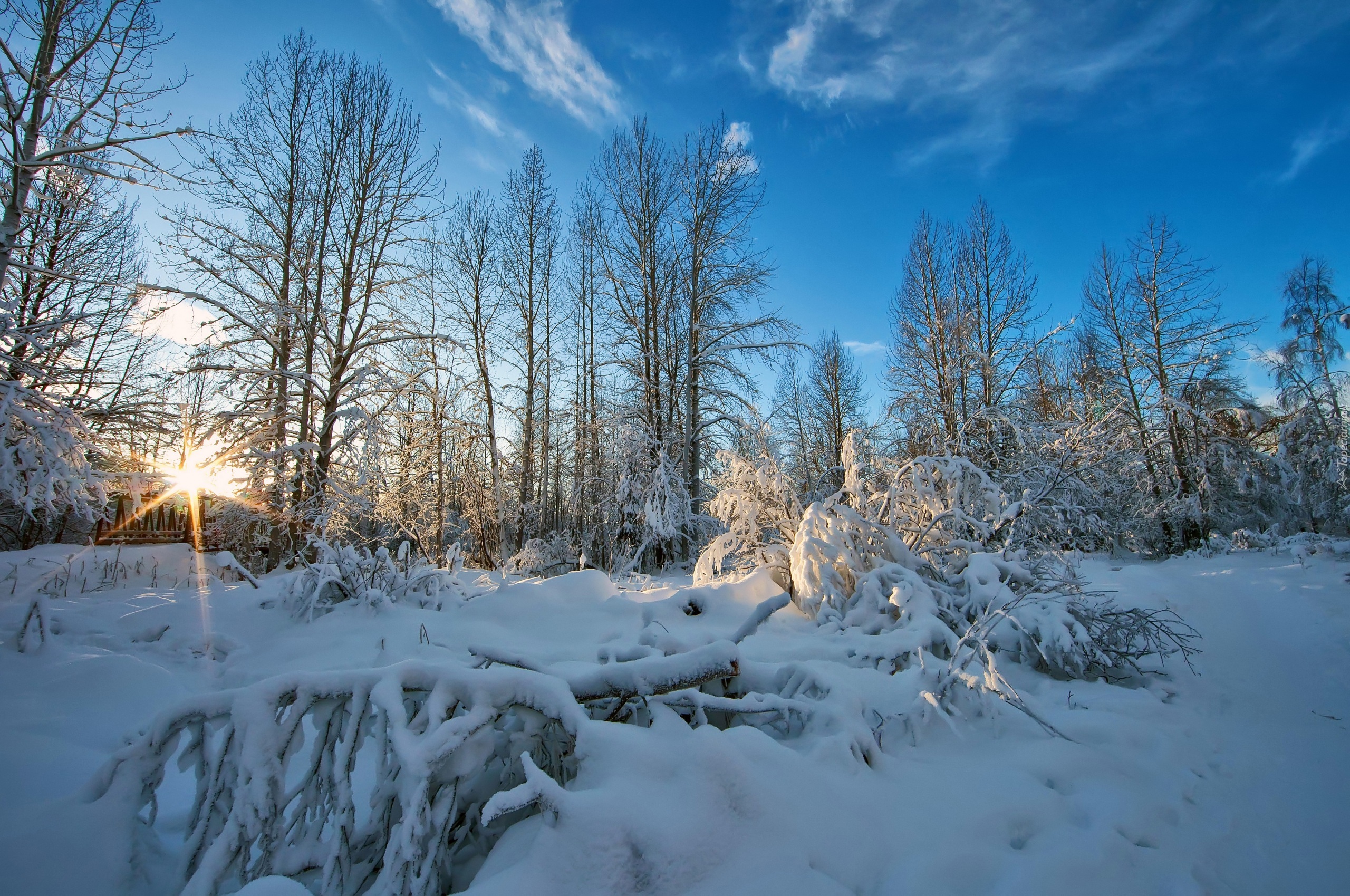 Edytor tapety: Promienie słońca wpadają do zasypanego śniegiem lasu