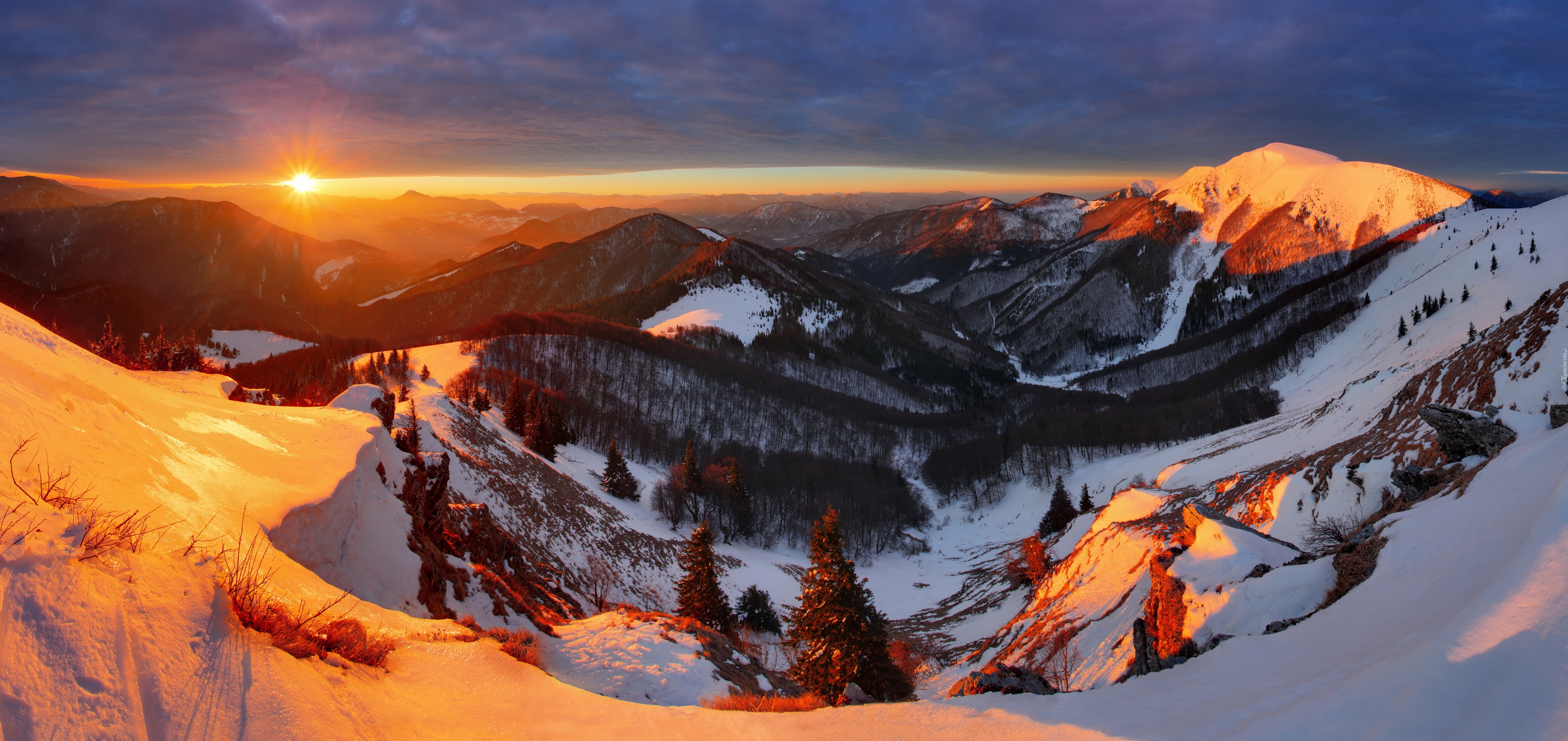 Edytor tapety: Ośnieżone góry porośnięte drzewami w blasku zachodzącego słońca