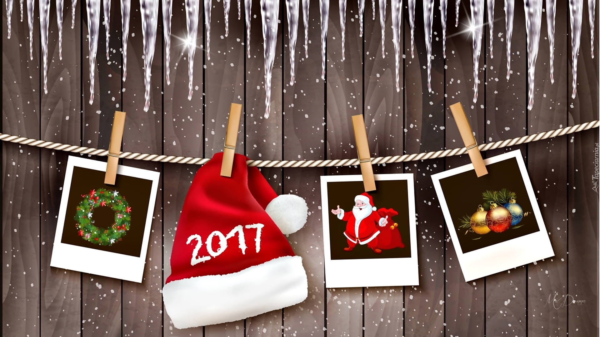 Edytor tapety: Fotografie i czapka Mikołaja zawieszone dekoracyjnie na sznurku