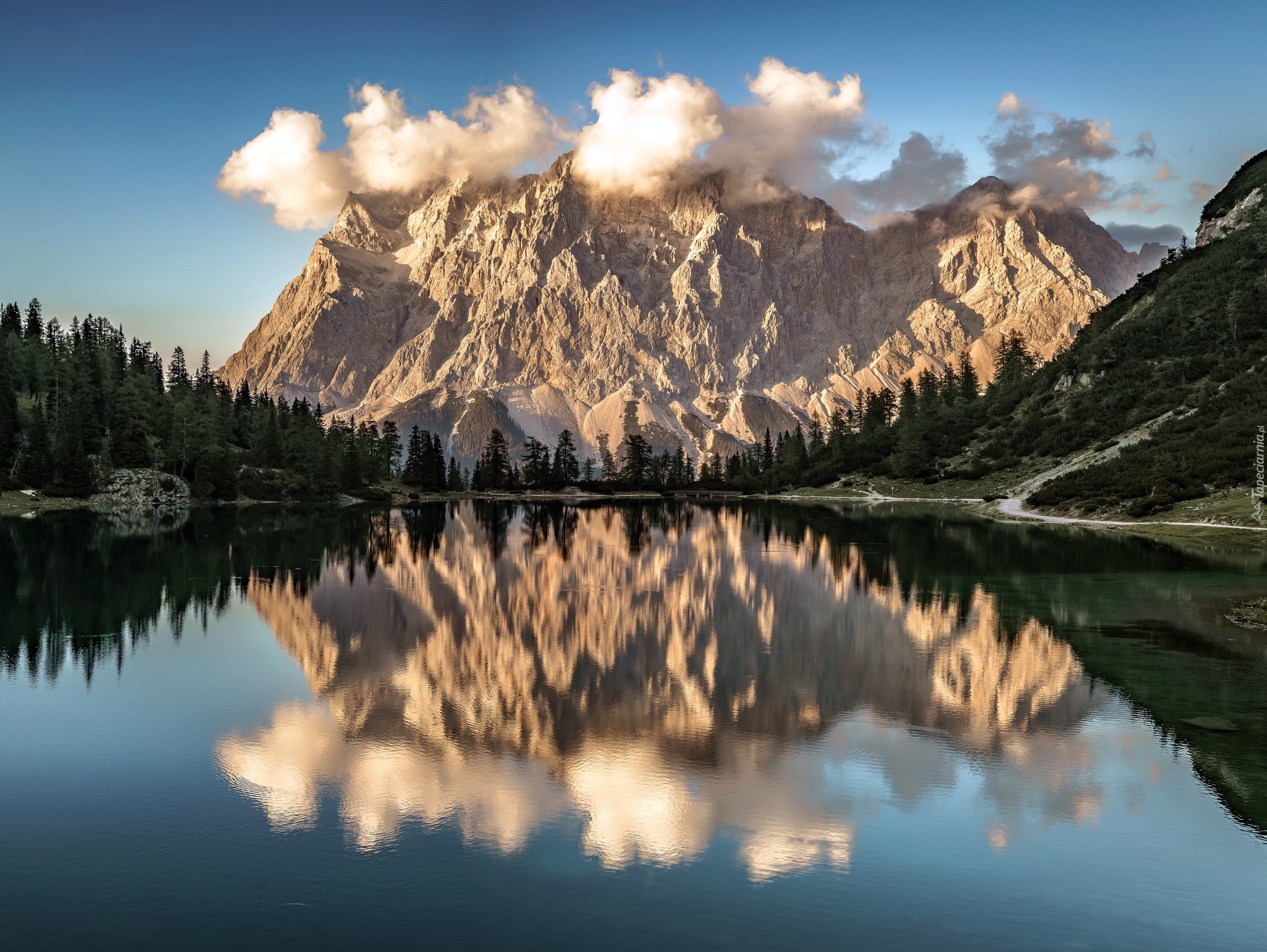 Edytor tapety: Chmury i górski las odbijają się w jeziorze