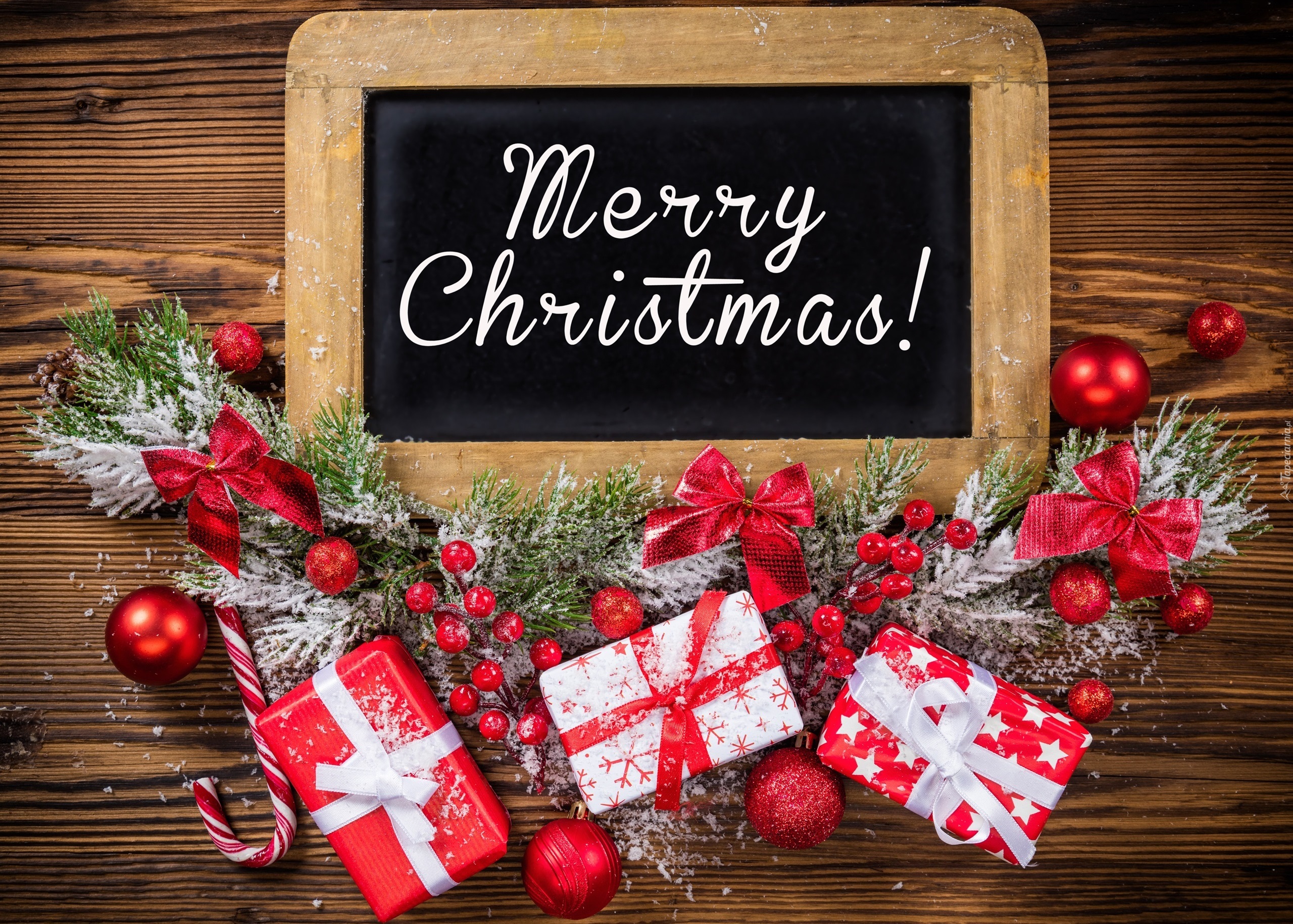 Edytor tapety: Bożonarodzeniowe życzenia z gwiazdkowymi prezentami i bombkami