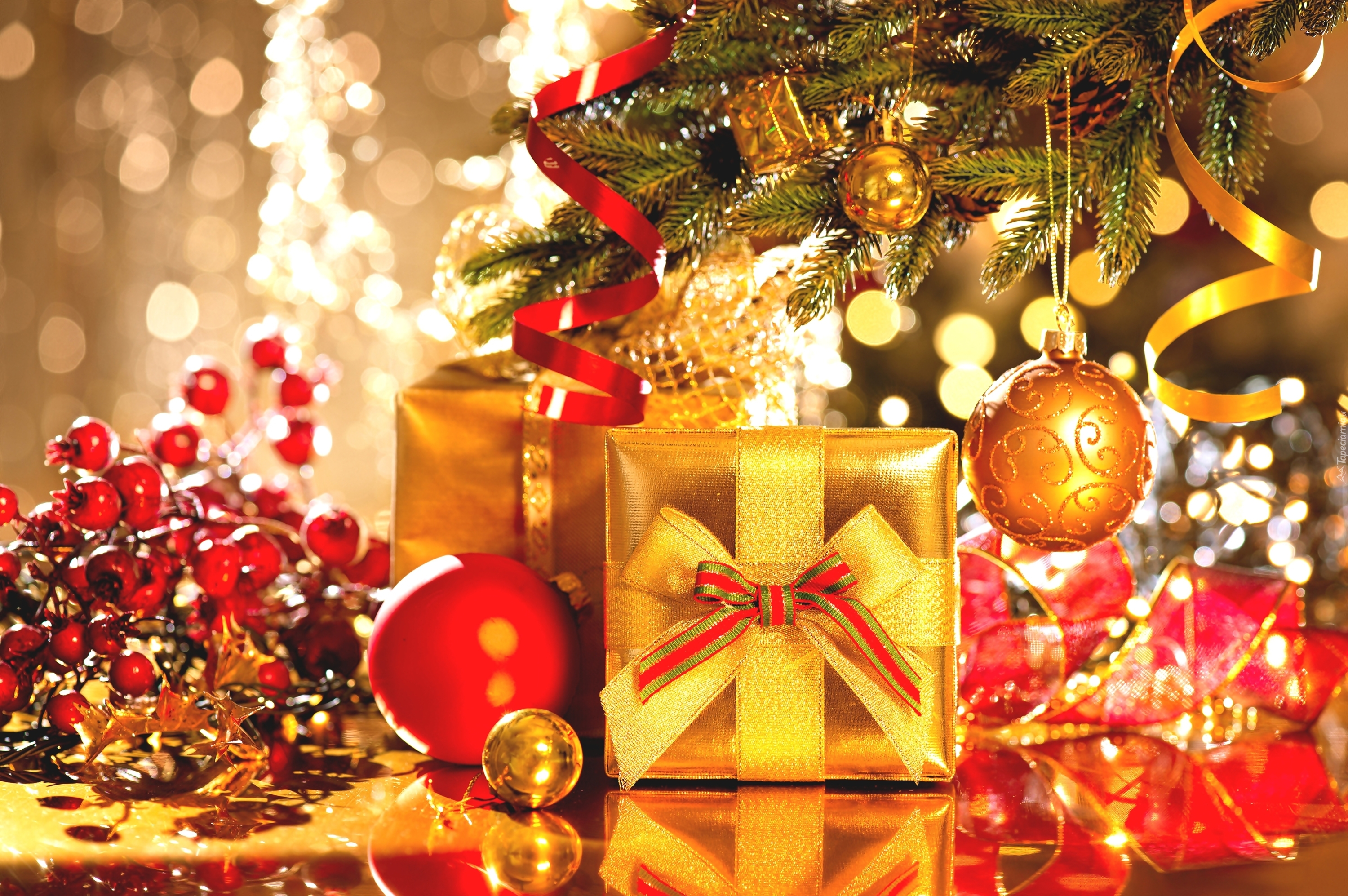Edytor tapety: Prezenty pod gałązką choinkową z bombkami