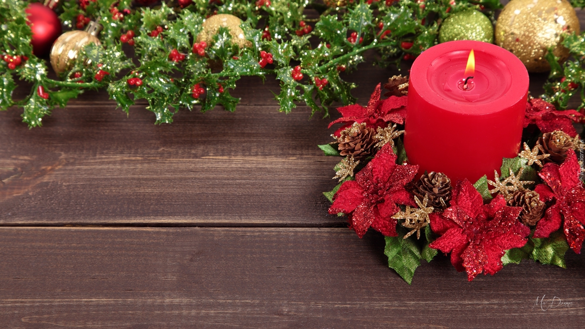 Edytor tapety: Dekoracyjne gałązki z bombkami i czerwoną świecą
