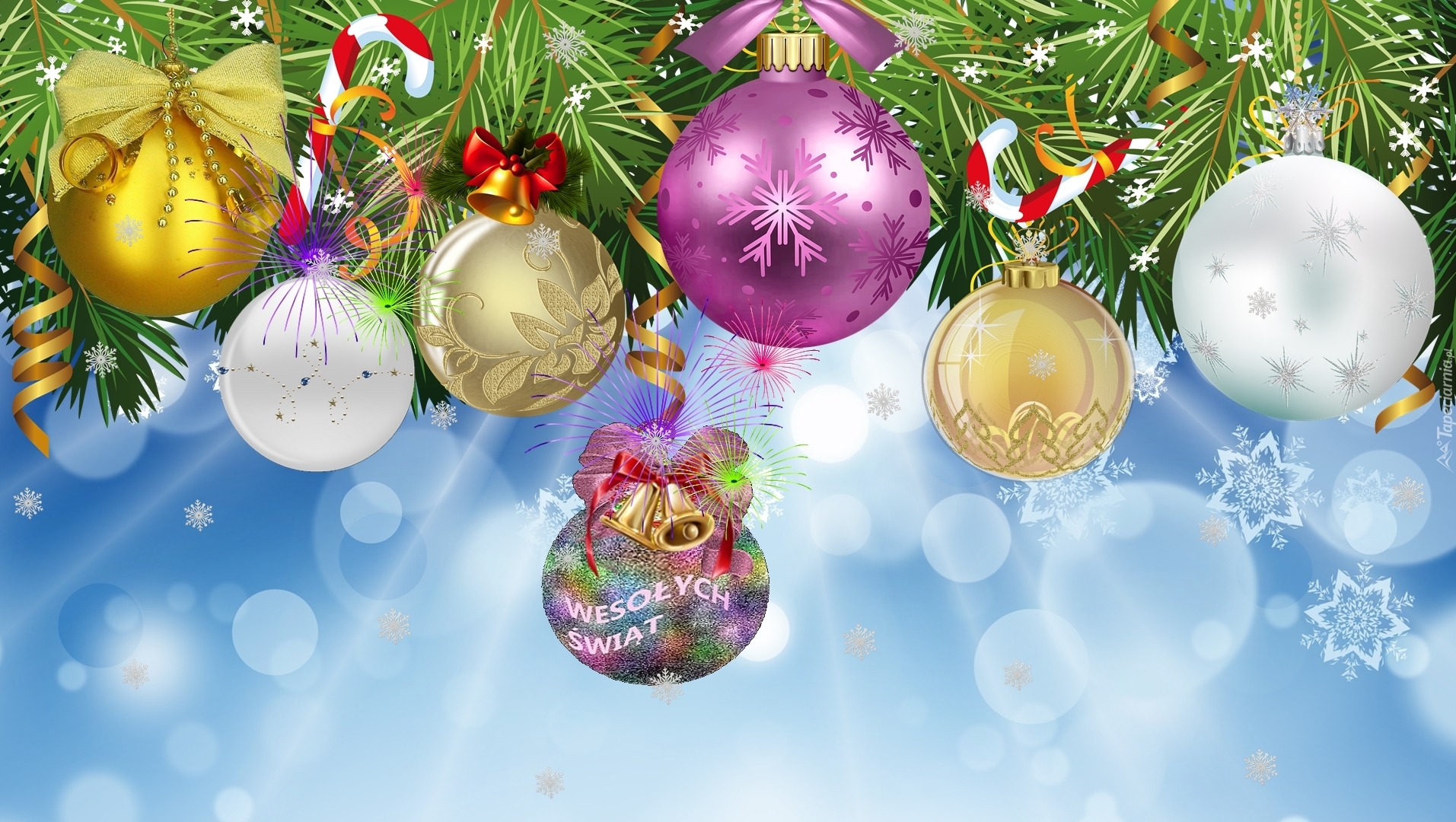 Edytor tapety: Bombki i ozdoby na gałązce z życzeniami świątecznymi