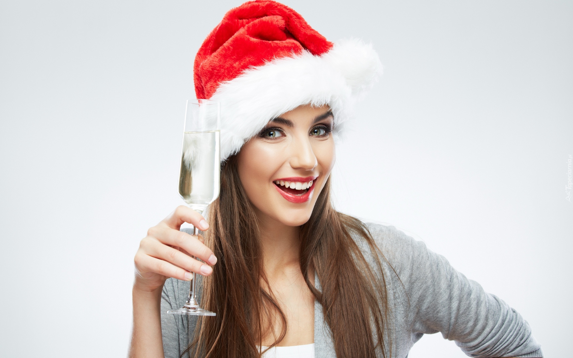 Edytor tapety: Uśmiechnięta kobieta w czapce Mikołaja z kieliszkiem szampana