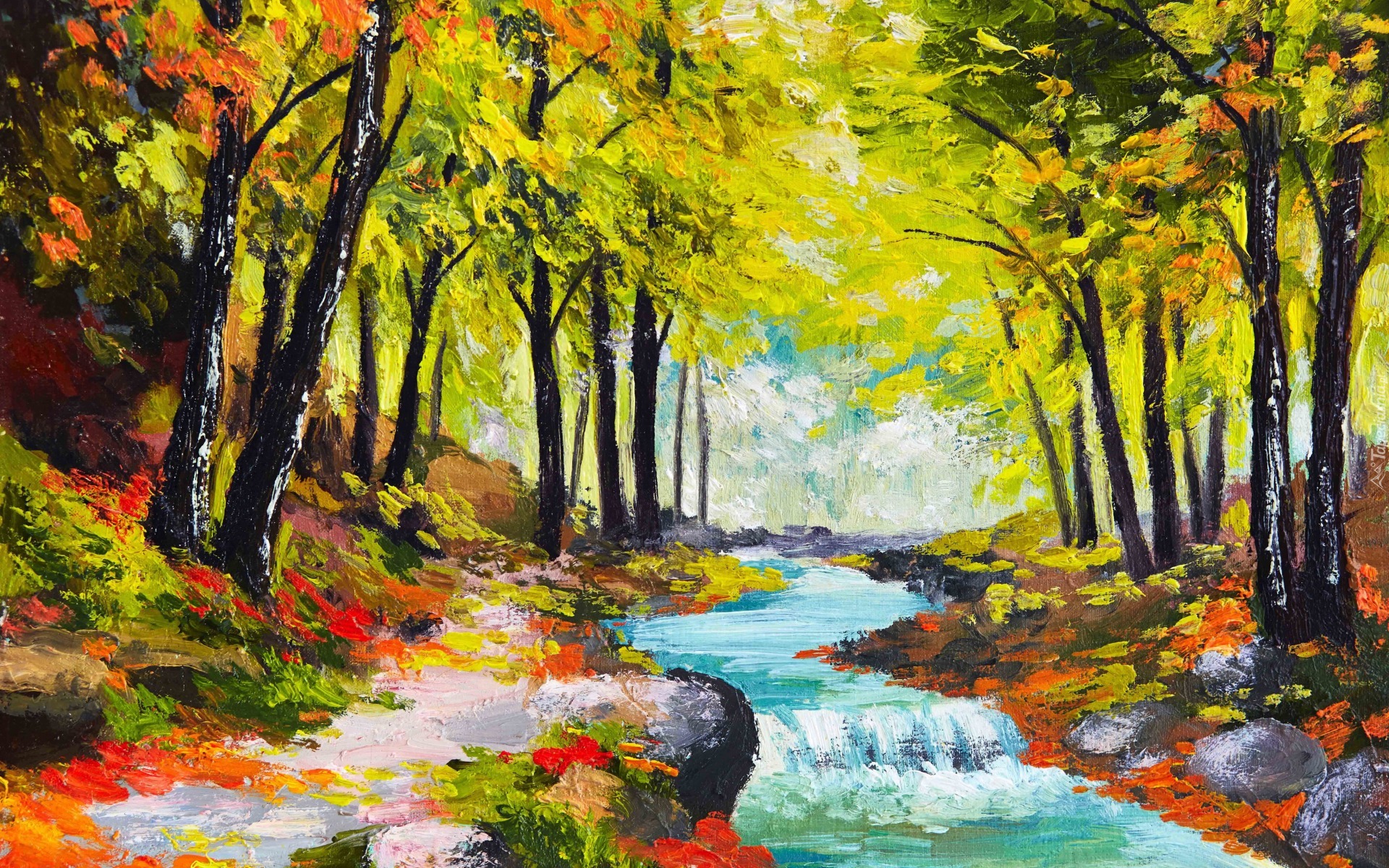 Edytor tapety: Rzeczka w lasku wśród kwiatów pędzlem malowana