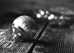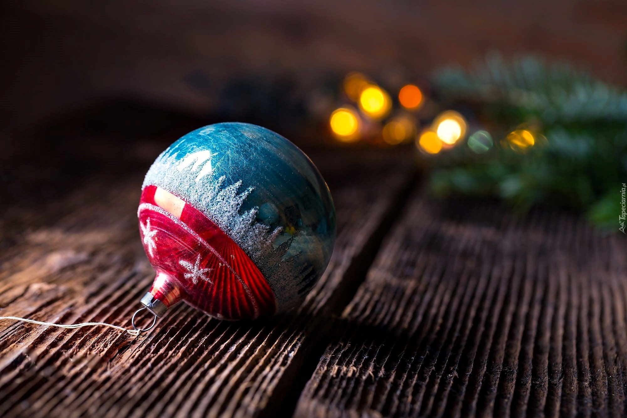 Edytor tapety: Ręcznie zdobiona bombka na deskach w blasku lampek