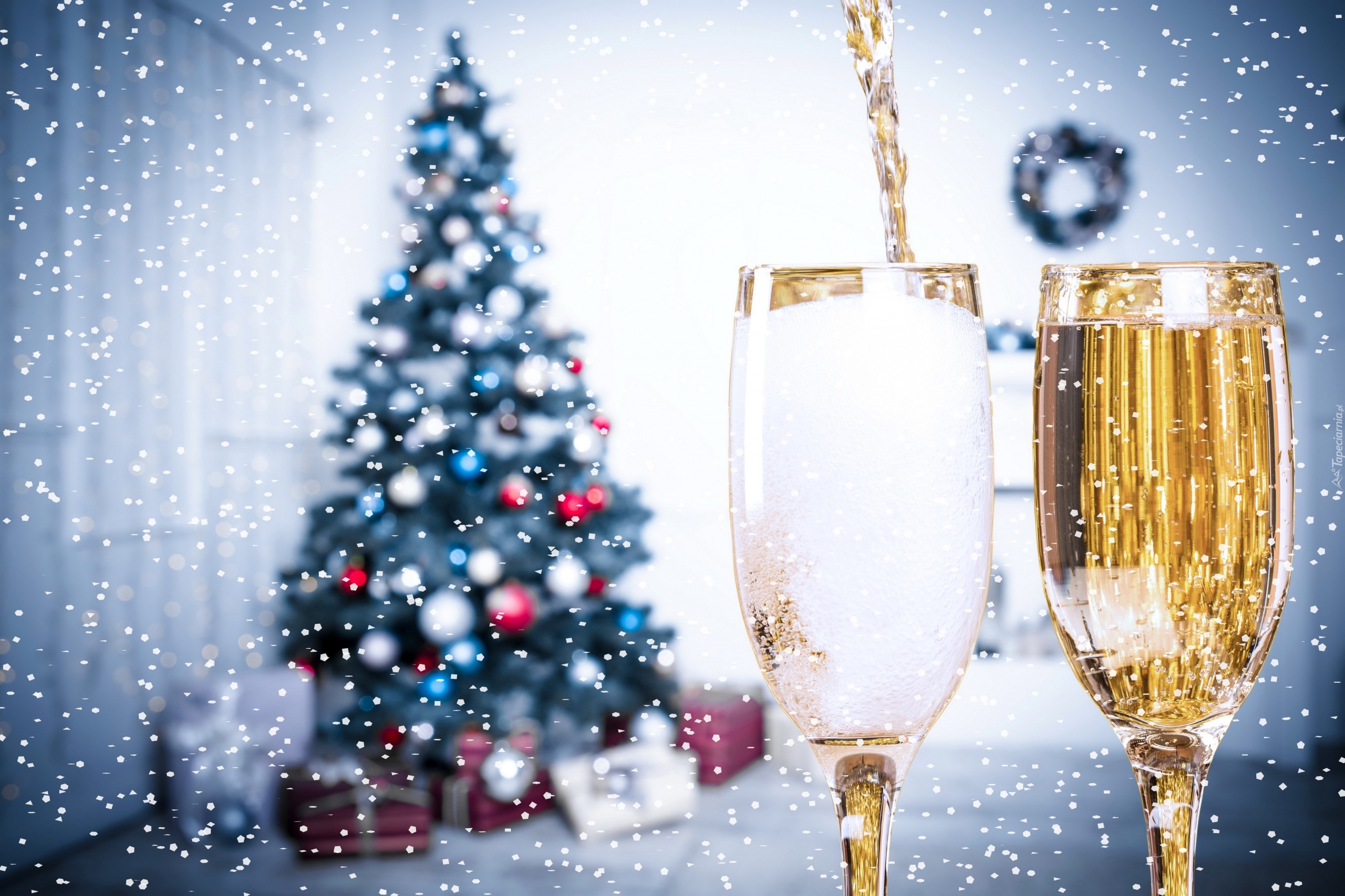Edytor tapety: Kieliszki z szampanem na tle choinki