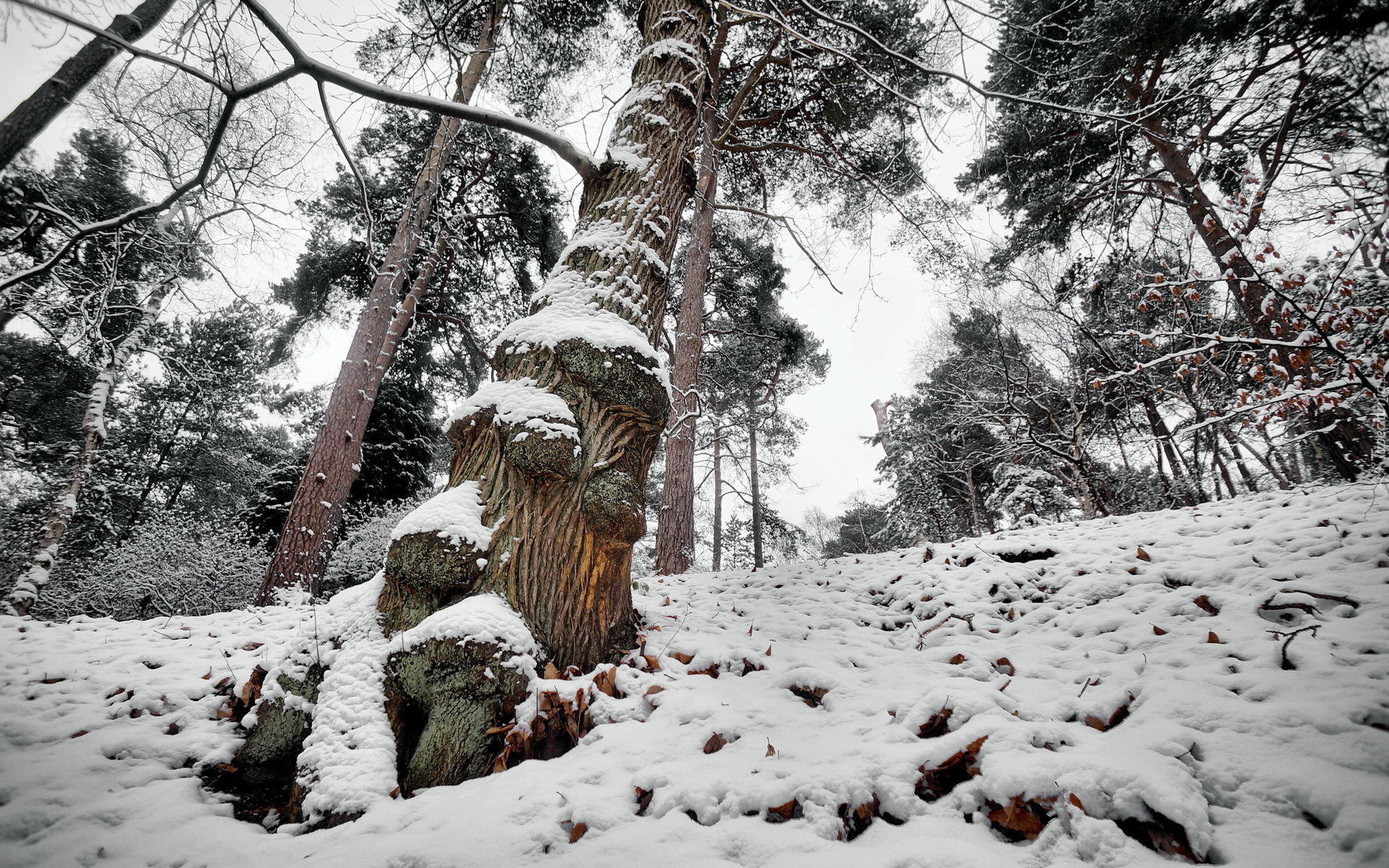 Edytor tapety: Śnieg przykrył zeschłe liście i drzewa w lesie