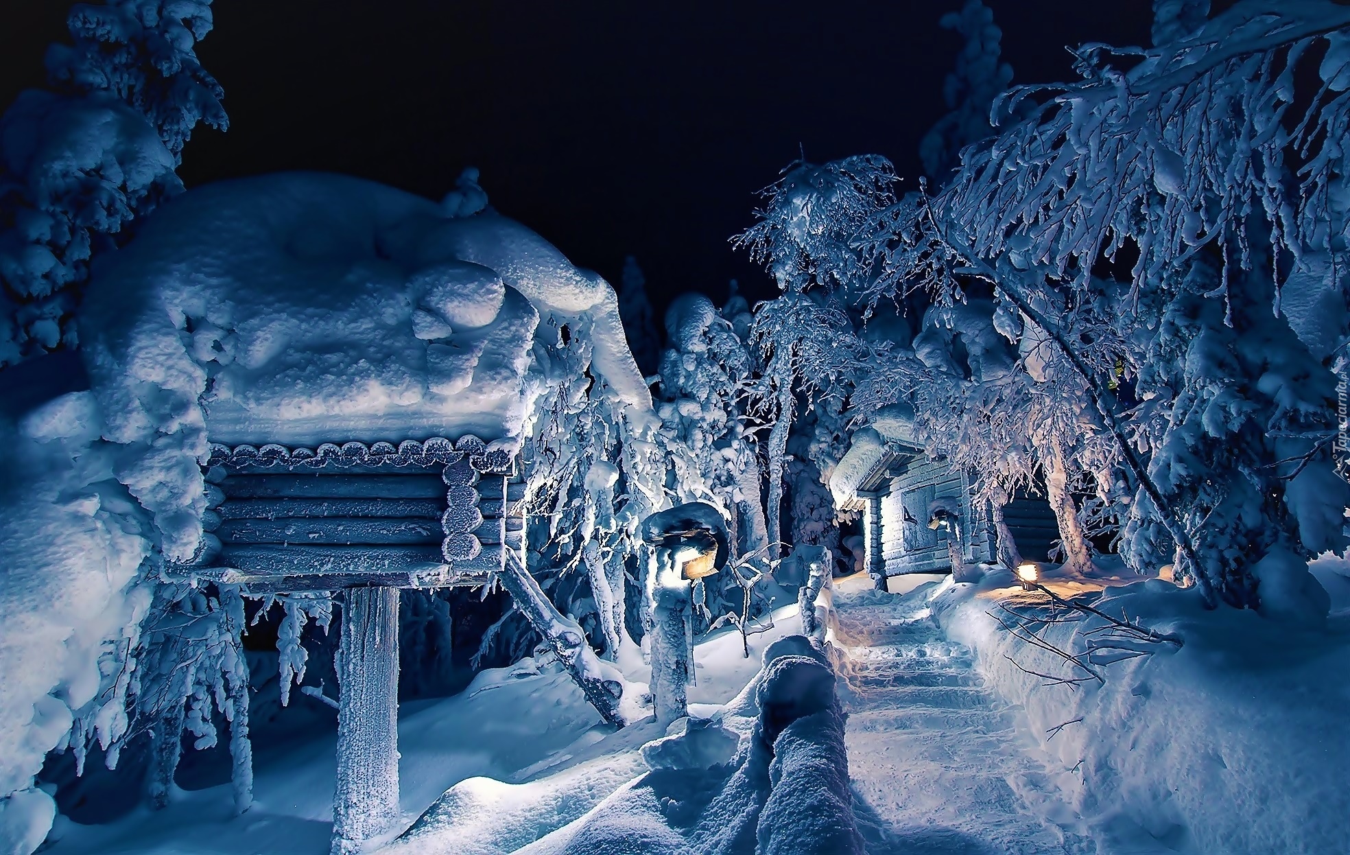 Edytor tapety: Drewniany domek w nocnej zimowej scenerii