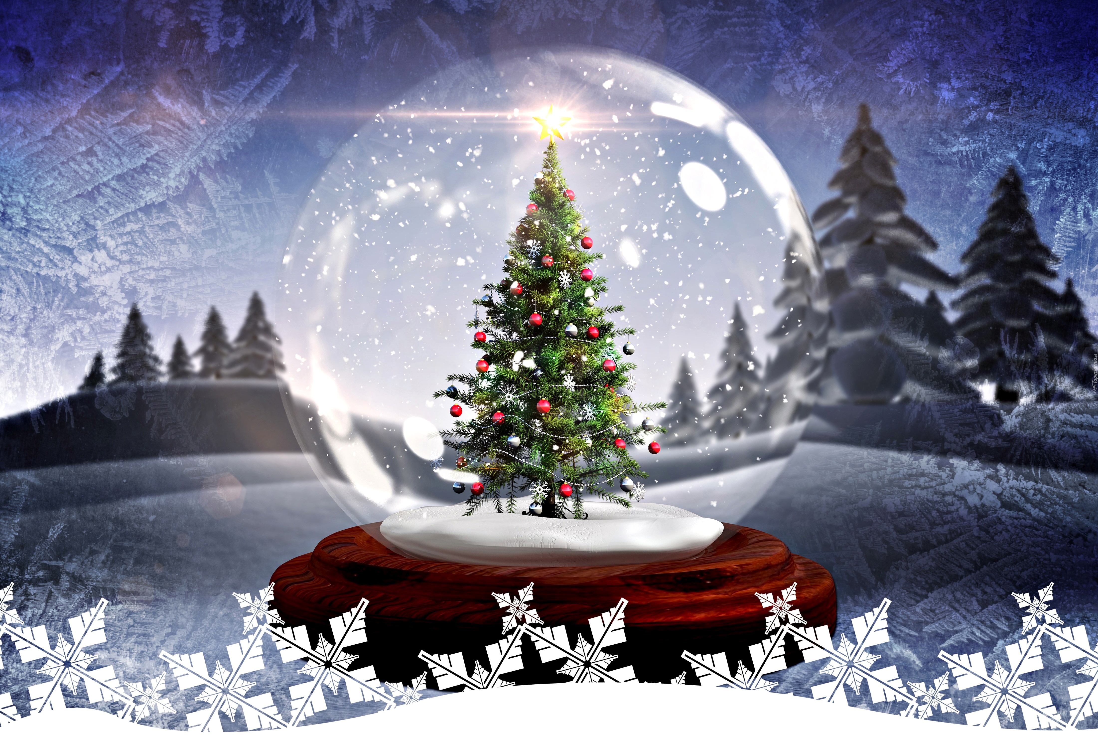 Edytor tapety: Choinka w śnieżnej kuli jako dekoracja bożonarodzeniowa