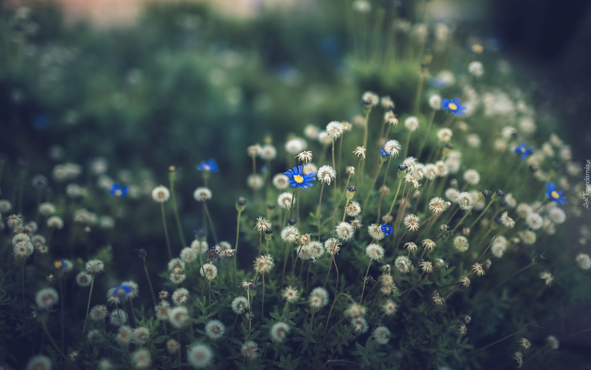 Edytor tapety: Łąka porośnięta niebieskimi kwiatami i mleczem