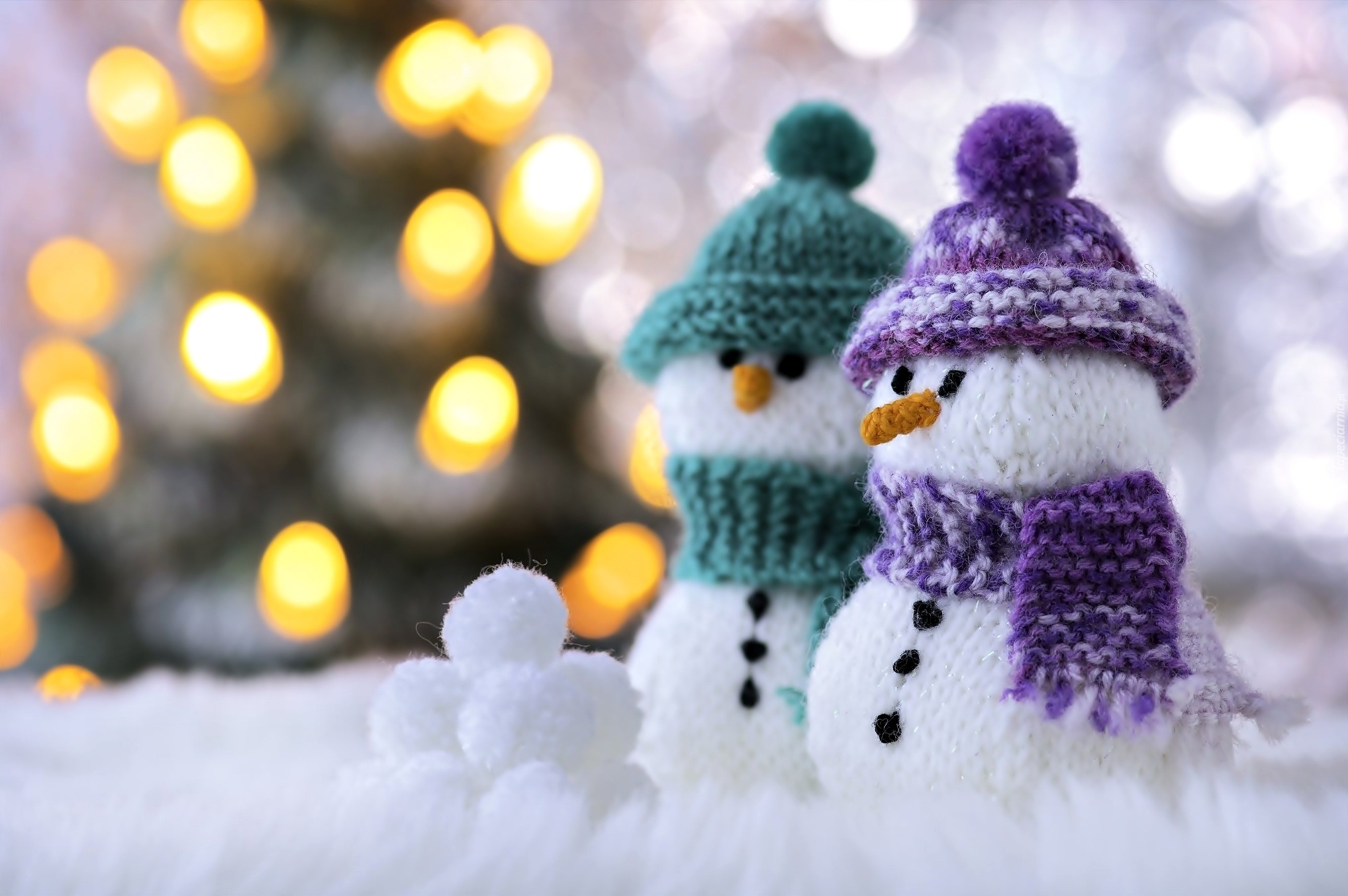 Edytor tapety: Bałwanki w czapeczkach na tle światełek