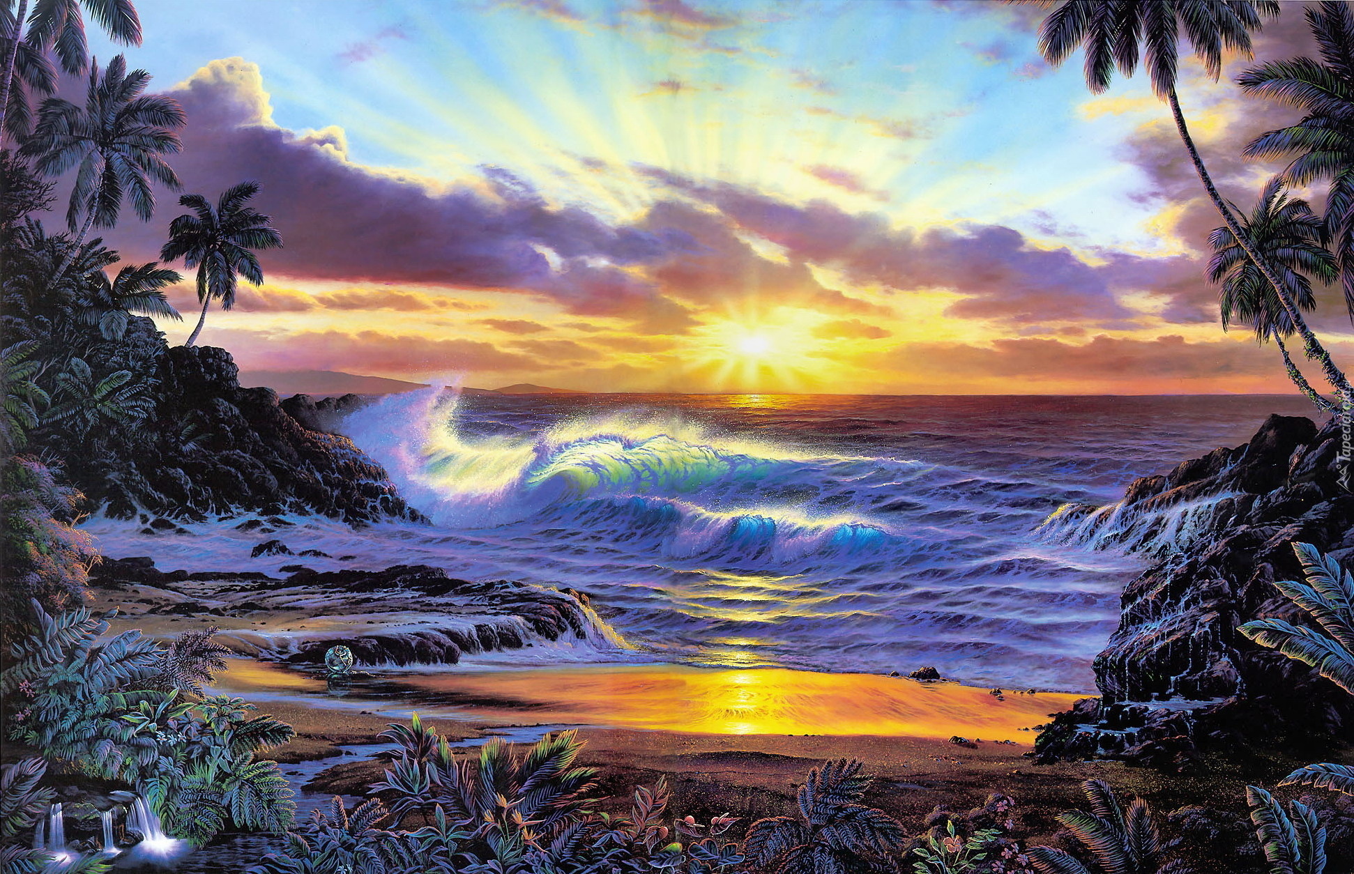 Edytor tapety: Palmy przy brzegu wzburzonego morza o zachodzie słońca