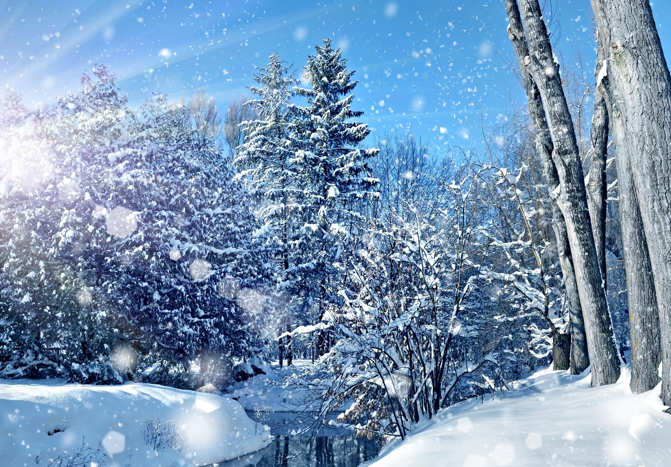 Edytor tapety: Mała rzeczka w lesie w promieniach zimowego słońca