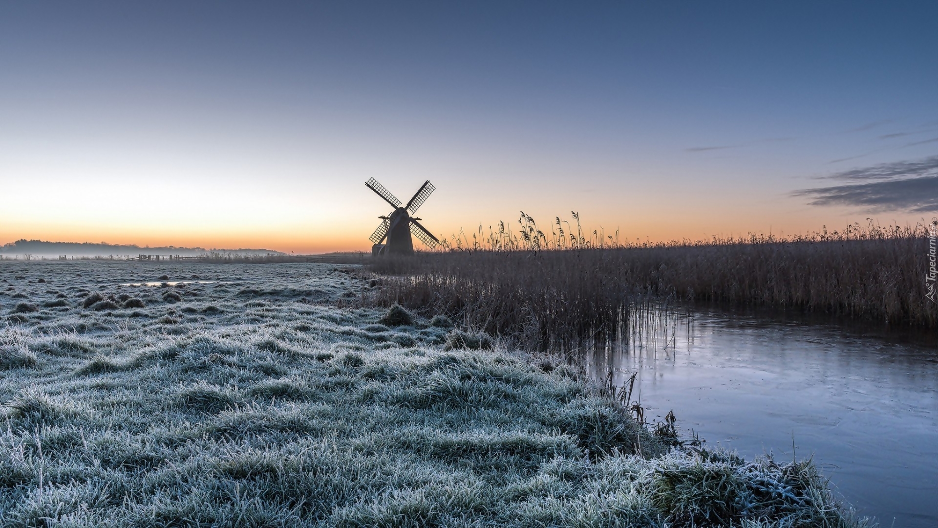 Edytor tapety: Wiatrak nad rzeką wśród oszronionych zimowych traw