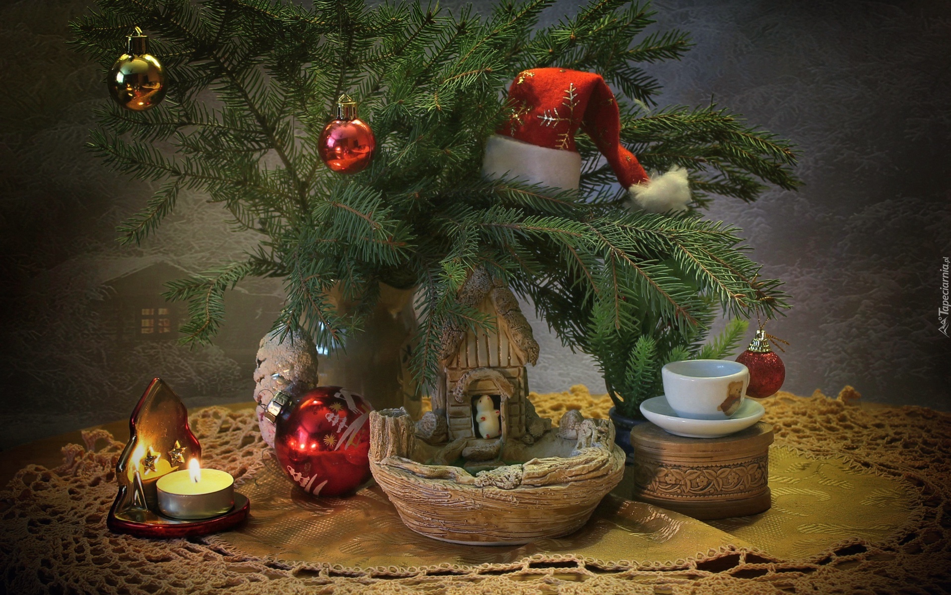 Edytor tapety: Świąteczna dekoracja z gałązkami, ozdobami i świeczką