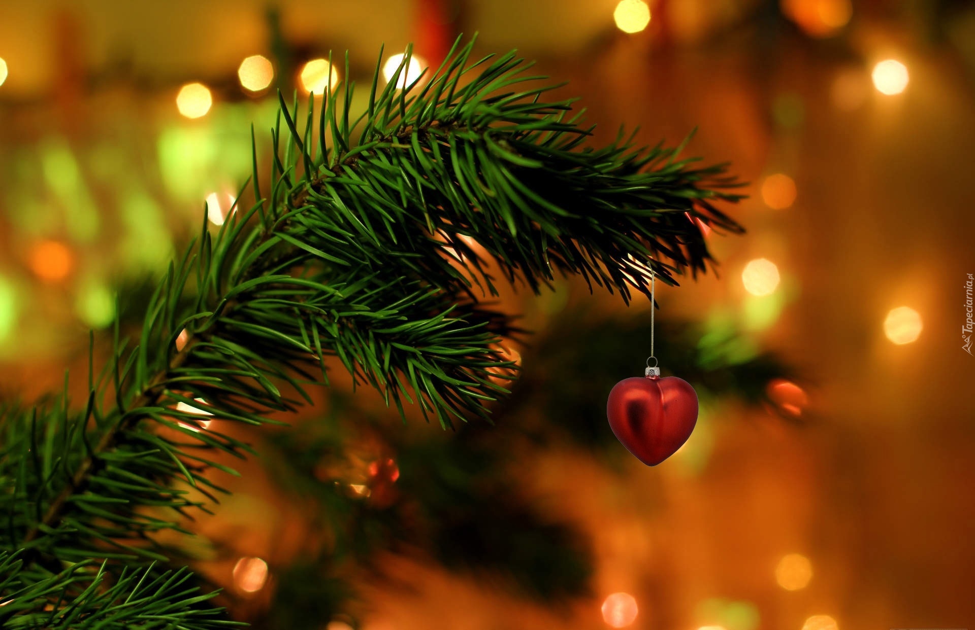 Edytor tapety: Czerwona bombka w kształcie serduszka wisi na gałązce