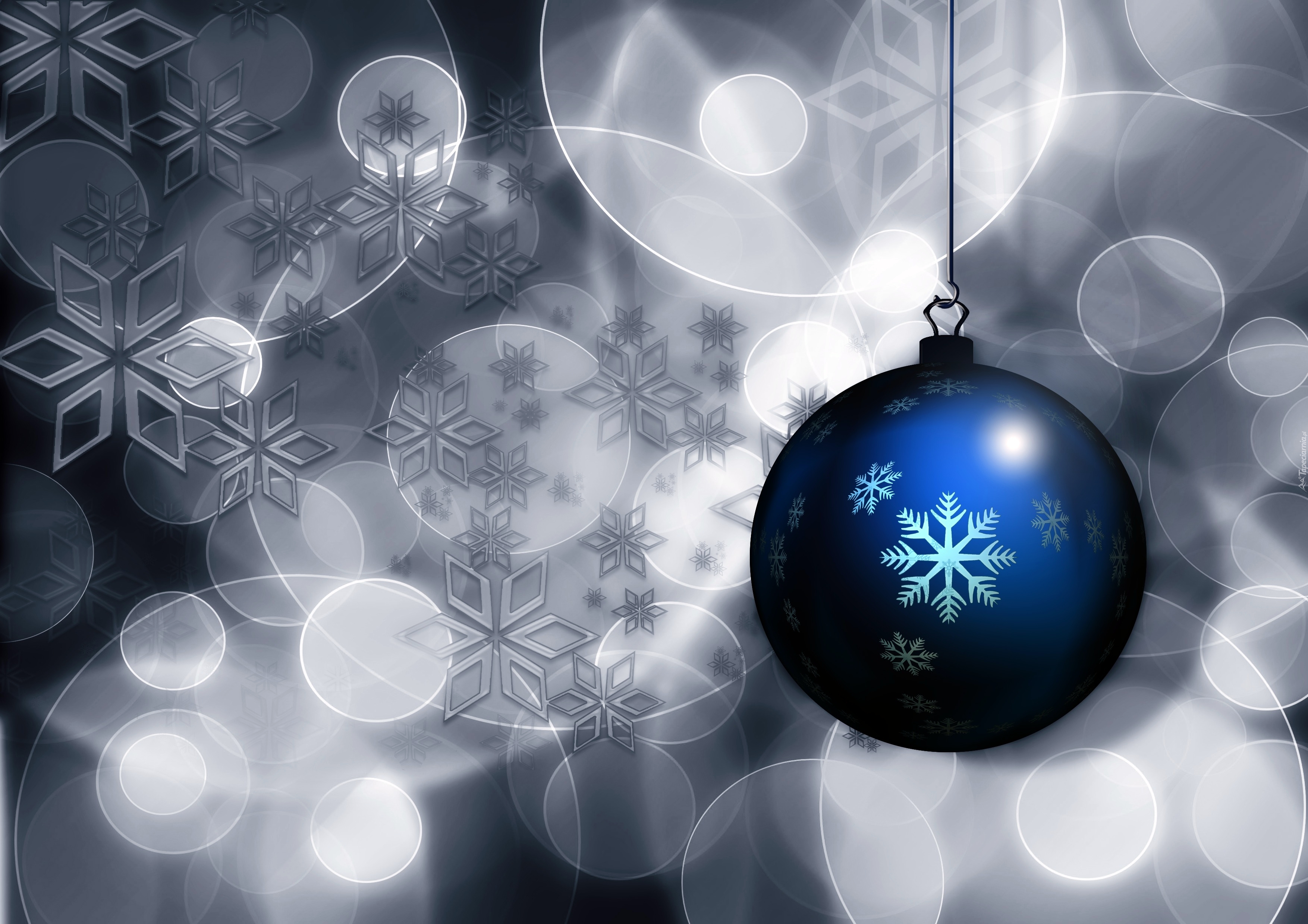 Edytor tapety: Wisząca niebieska bombka na tle gwiazdek