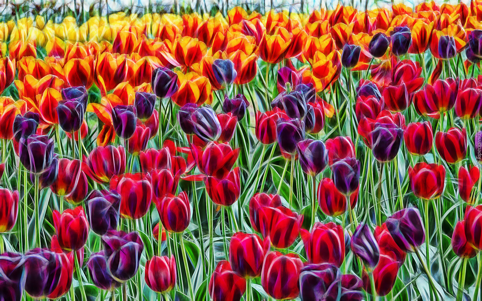 Edytor tapety: Łąka kolorowych tulipanów w grafice fractalius
