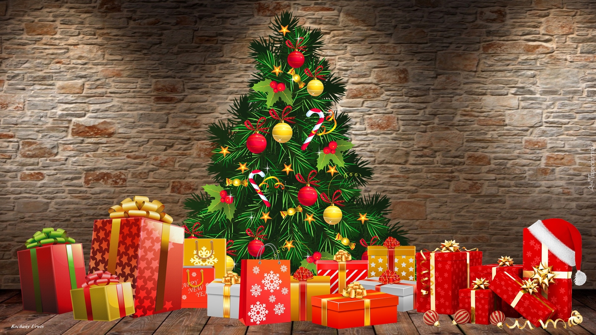 Edytor tapety: Świąteczna choinka z prezentami na tle muru