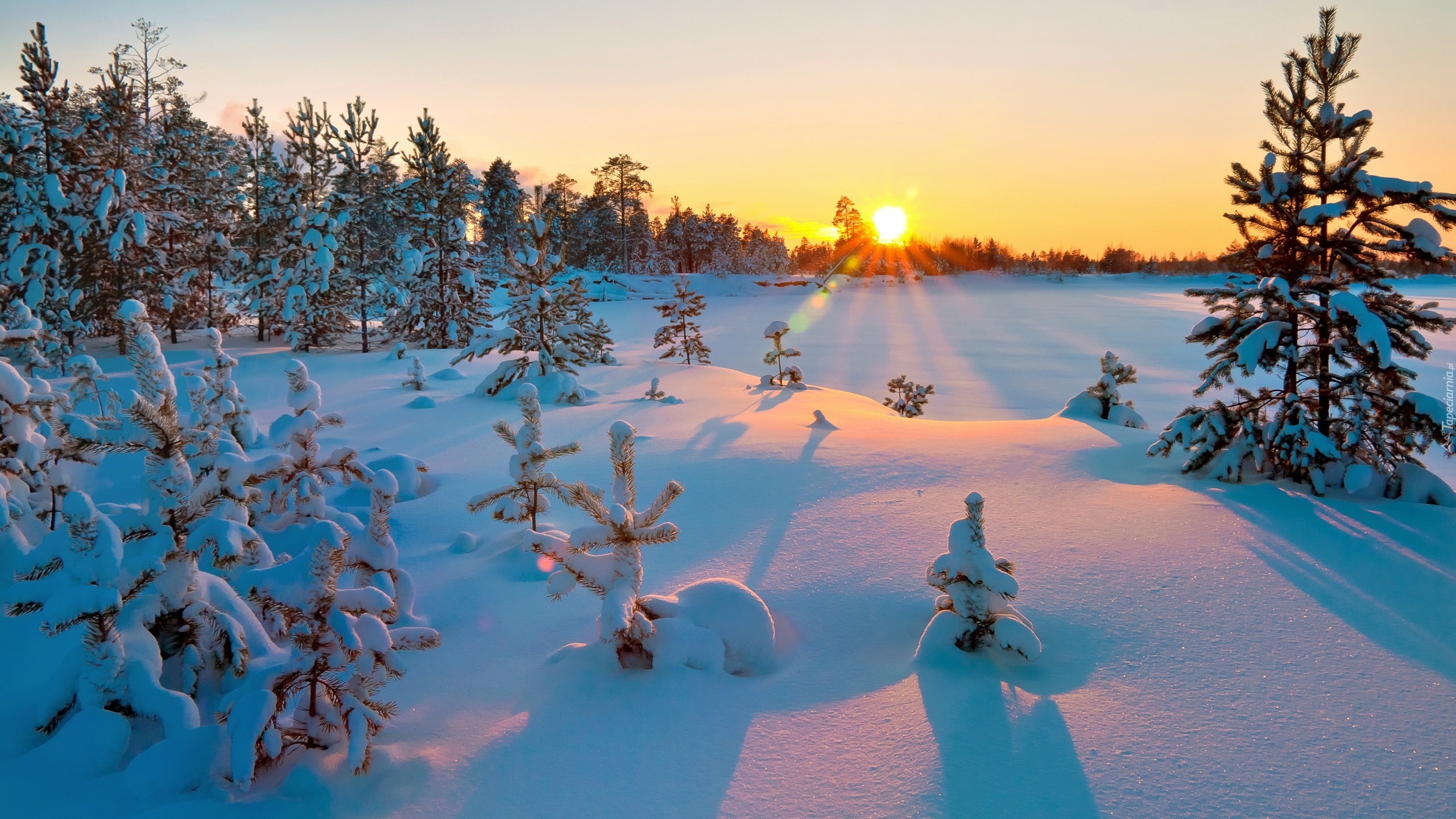 Edytor tapety: Ośnieżone świerki w blasku wschodzącego słońca