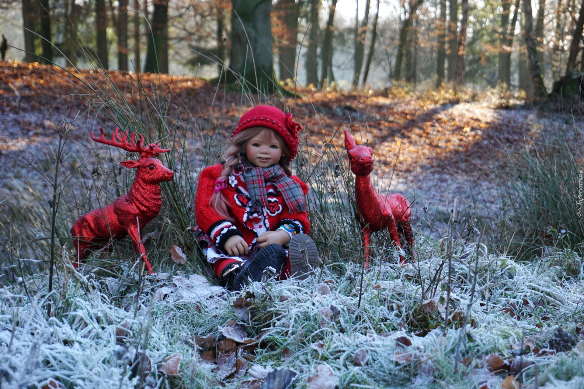 Edytor tapety: Lalka i dwie figurki jelonków w lesie