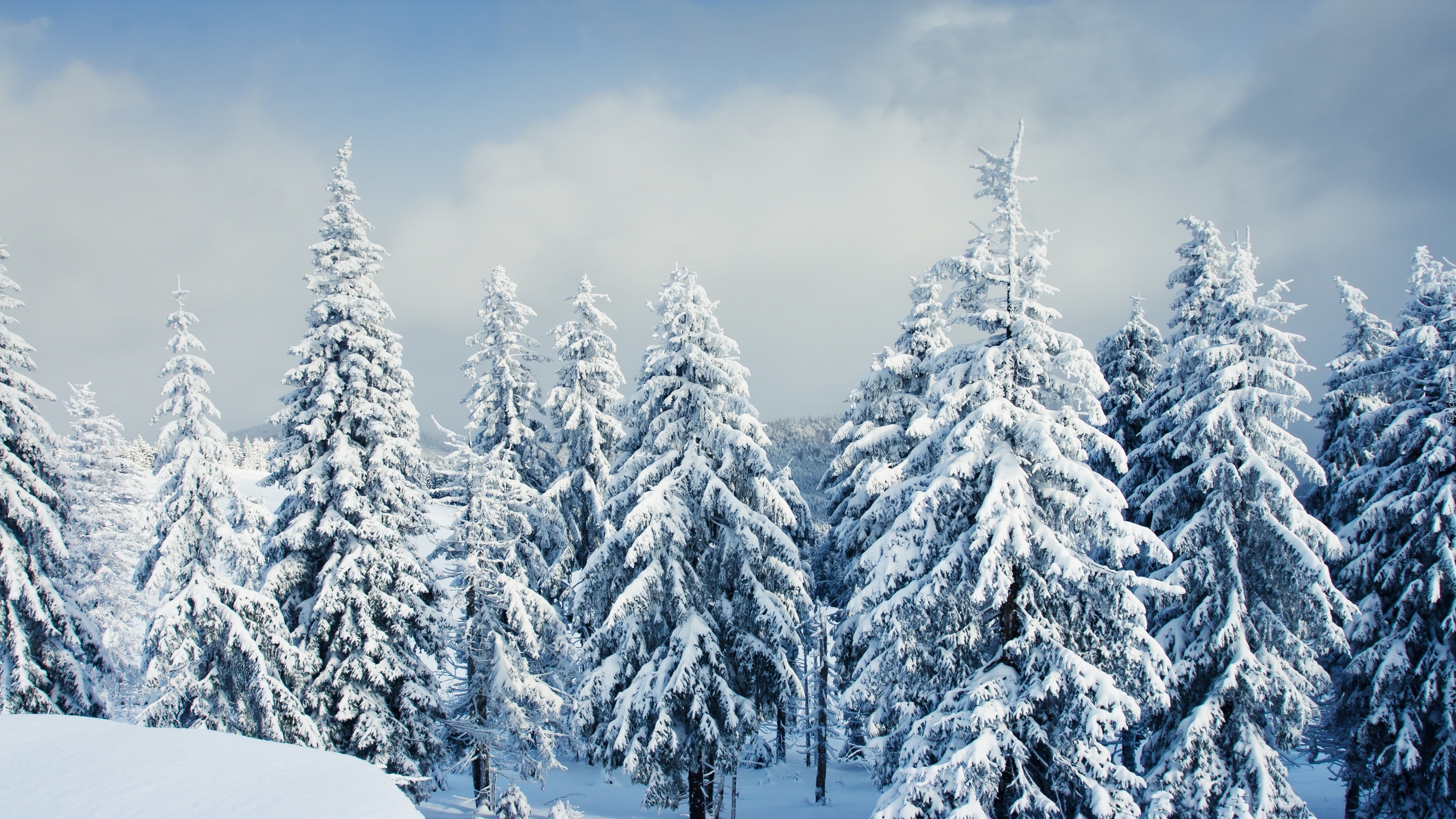 Edytor tapety: Ośnieżony świerkowy las z chmurami w tle