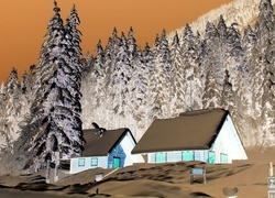 Edytor tapety: Drewniane domki na tle ośnieżonego lasu