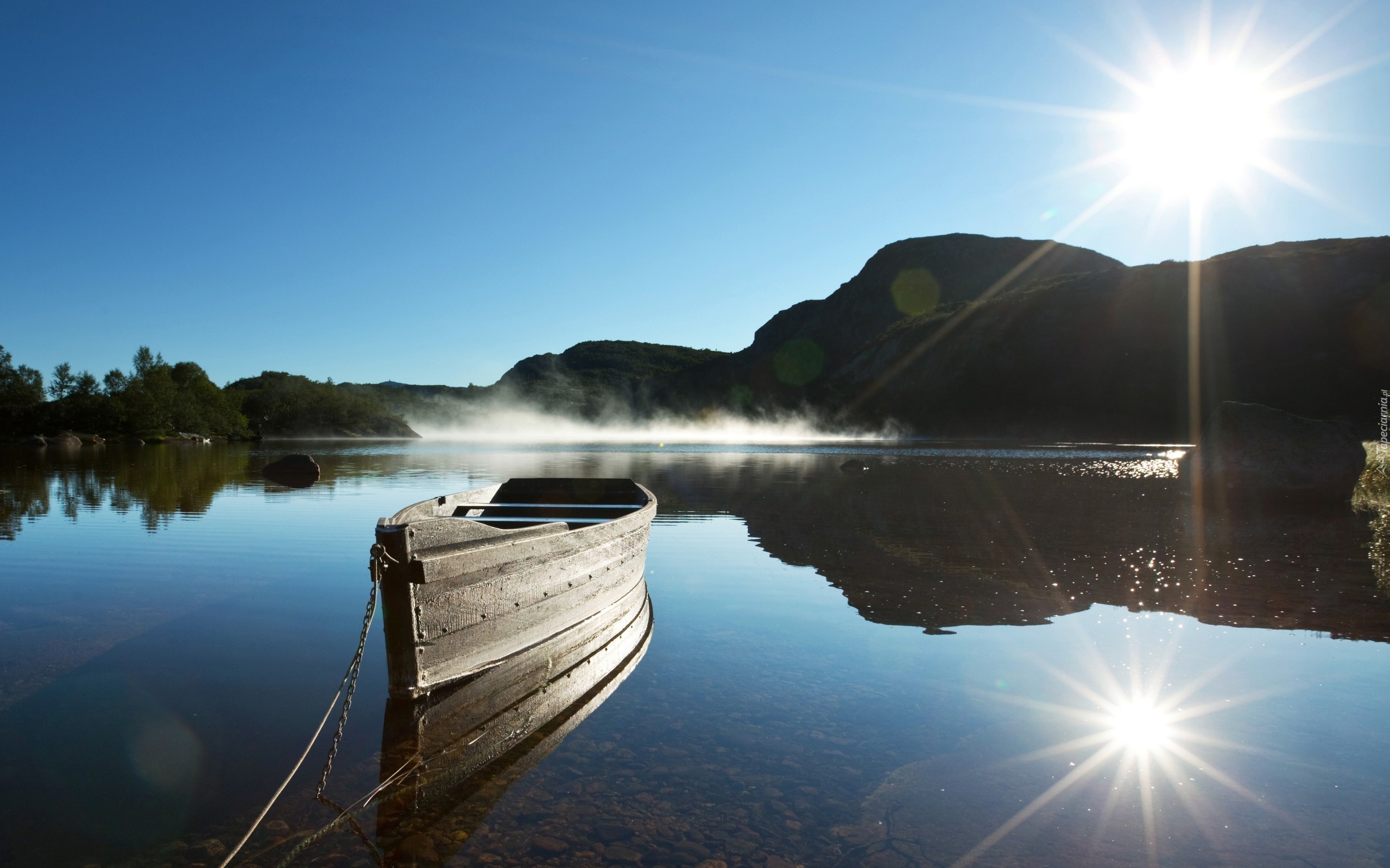 Edytor tapety: Łódka na jeziorze w promieniach słońca