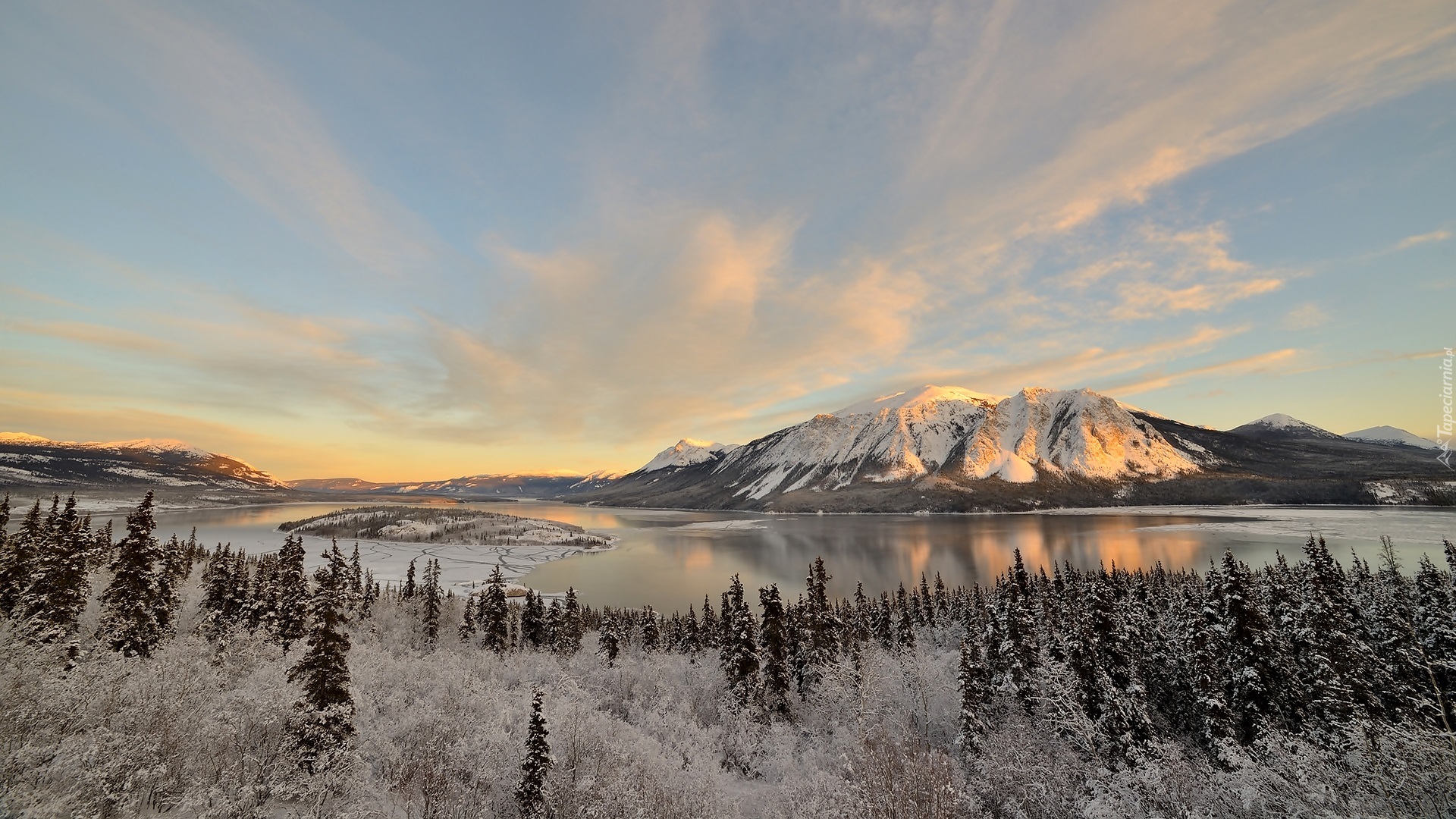 Edytor tapety: Zimowy krajobraz z lasem, rzeką i górami