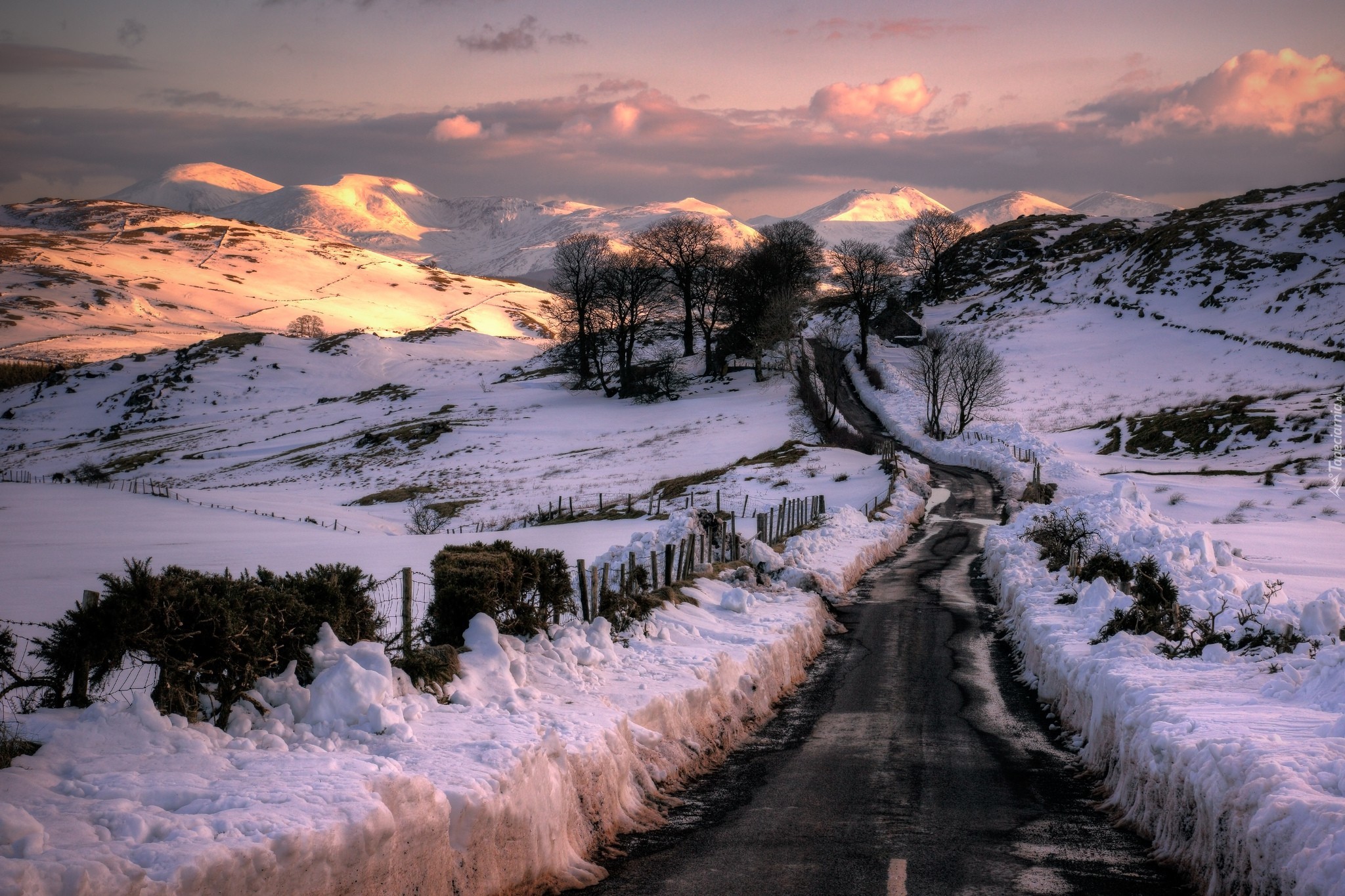 Edytor tapety: Odśnieżona górska droga ze śniegiem na poboczach