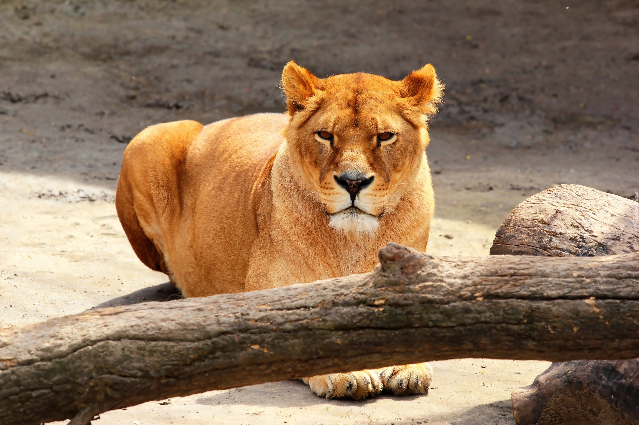 Edytor tapety: Lwica leżąca za konarem