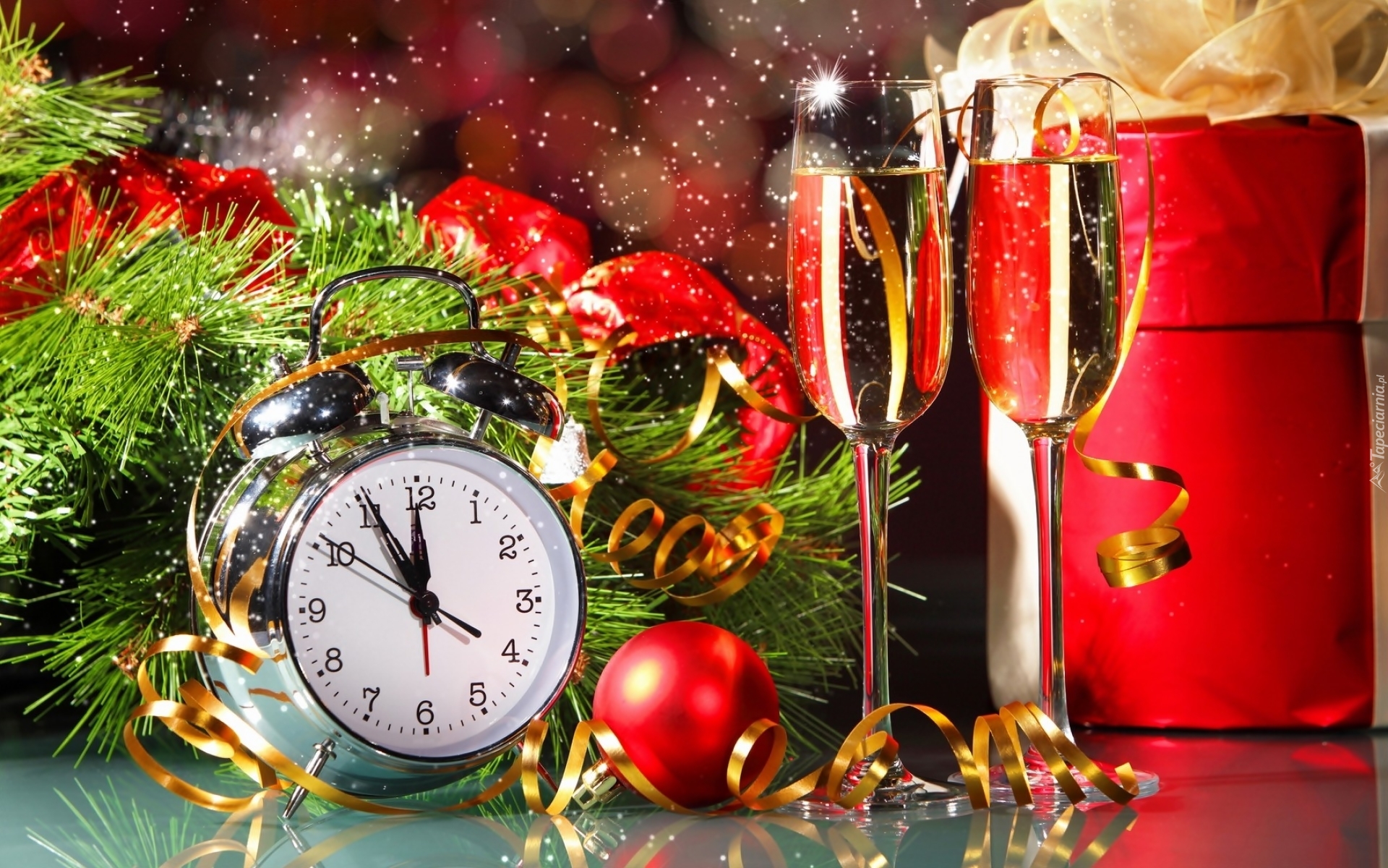 Edytor tapety: Sylwestrowa dekoracja z budzikiem i kieliszkami szampana