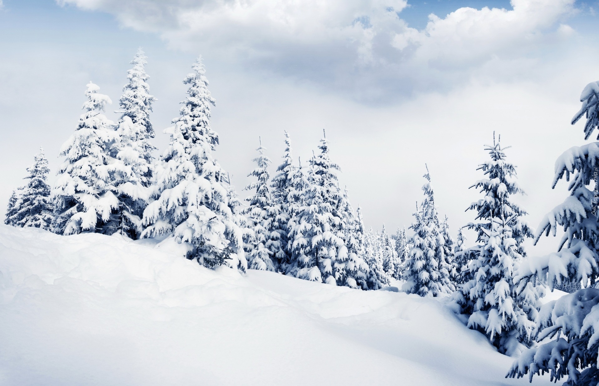 Edytor tapety: Ośnieżone świerki na wzgórzu