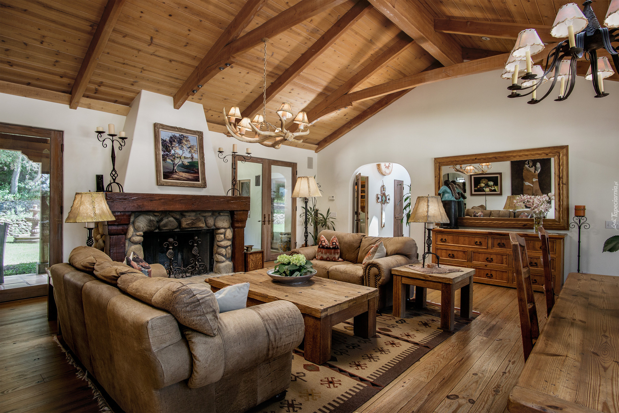 Edytor tapety: Wnętrze salonu z drewnianymi meblami i kominkiem