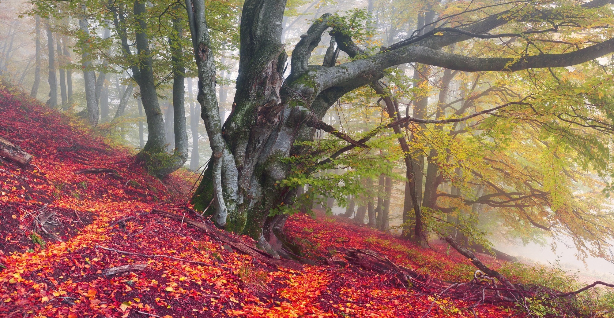 Edytor tapety: Jesień w lesie z kolorowymi liśćmi pod drzewami