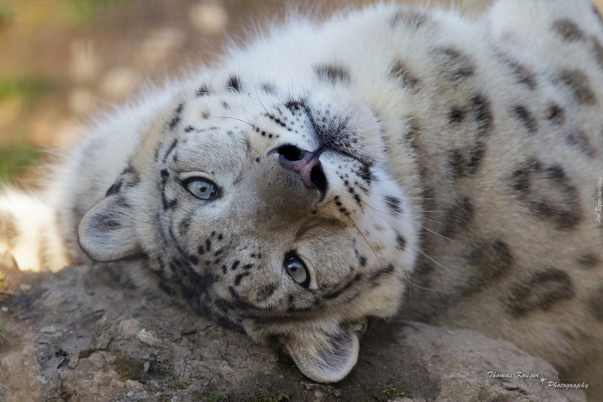 Edytor tapety: Młody śnieżny irbis wyleguje się na skale