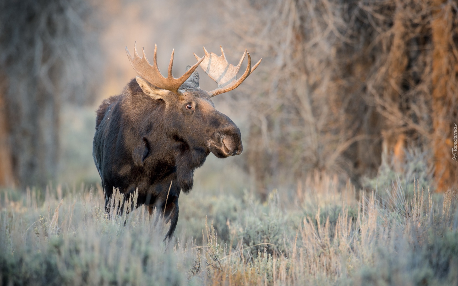 Edytor tapety: Łoś pośród oszronionych traw w lesie