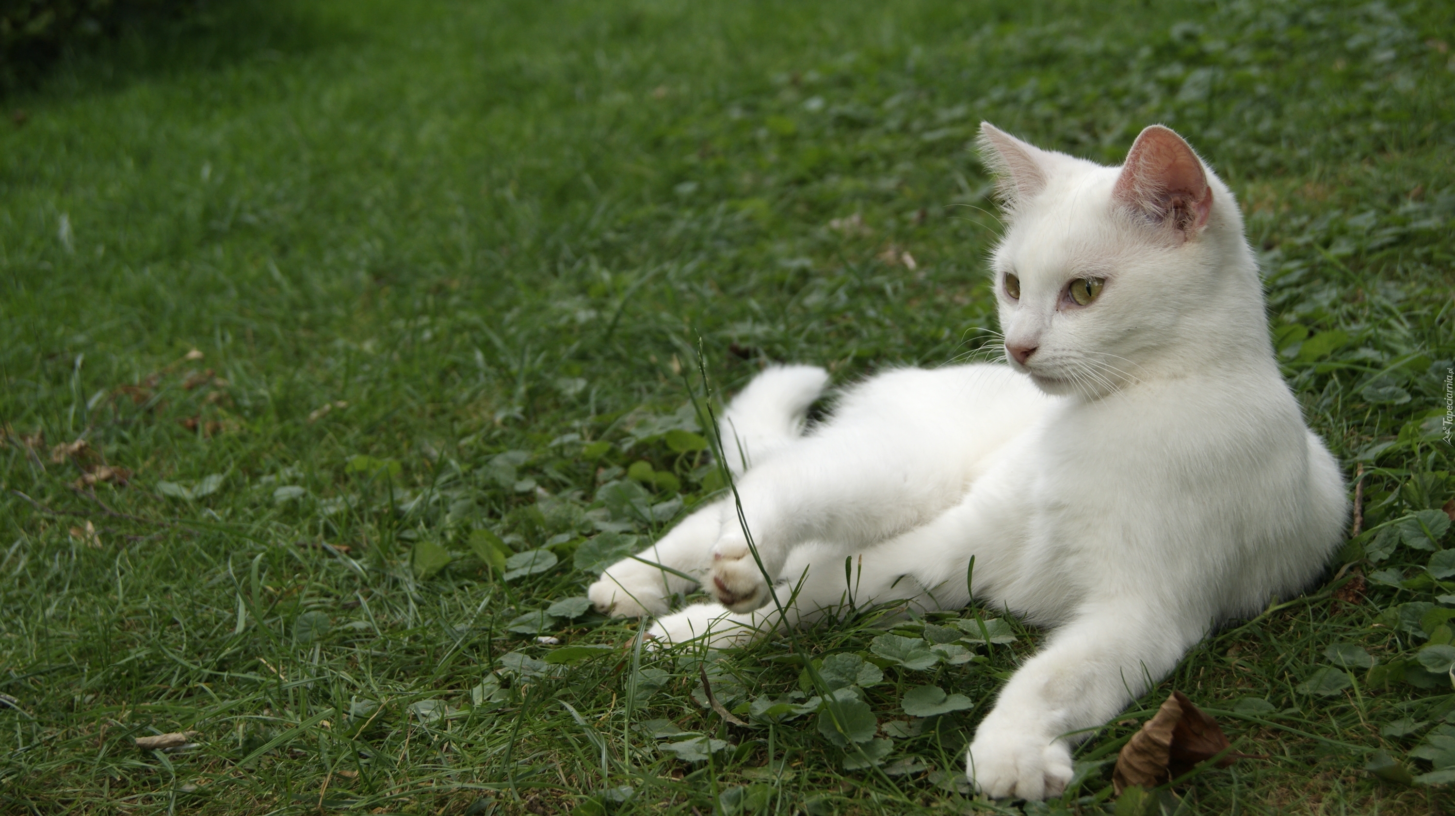 Edytor tapety: Biały kotek leniuchuje na trawie