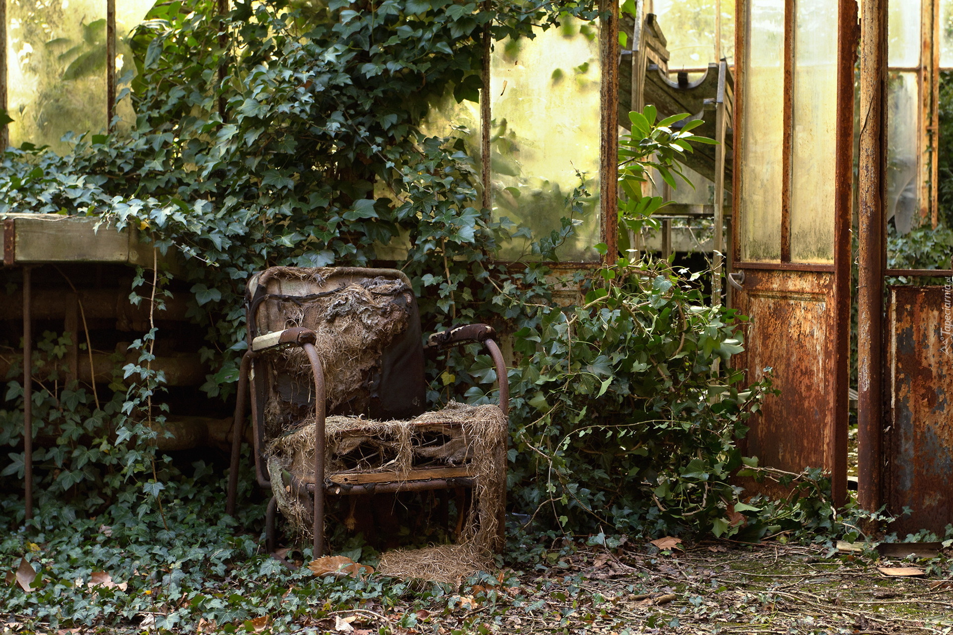 Edytor tapety: Zniszczony fotel w starej oranżerii porośniętej bluszczem