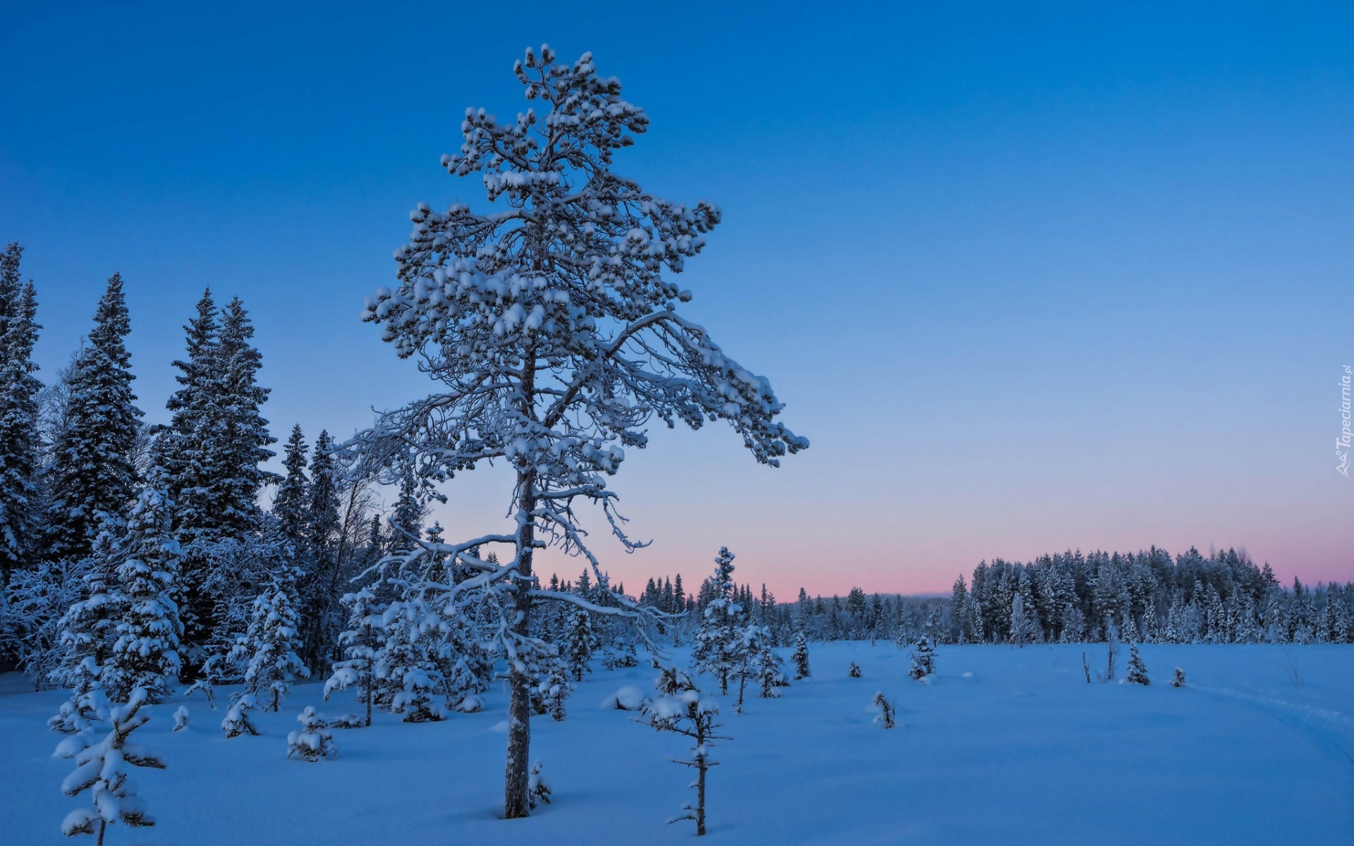 Edytor tapety: Świt budzi się ośnieżonym lesie