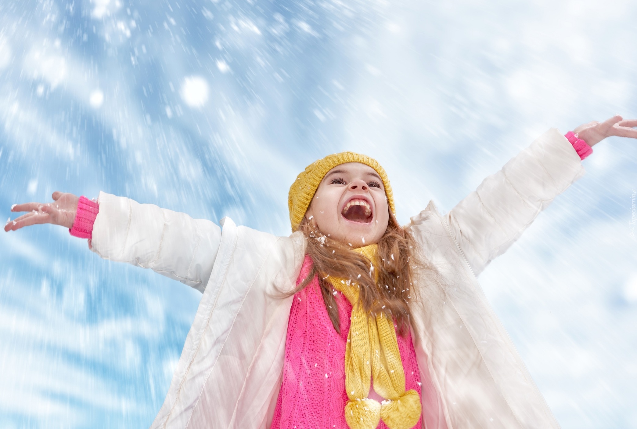 Edytor tapety: Dziewczynka ciesząca się sypiącym śniegiem