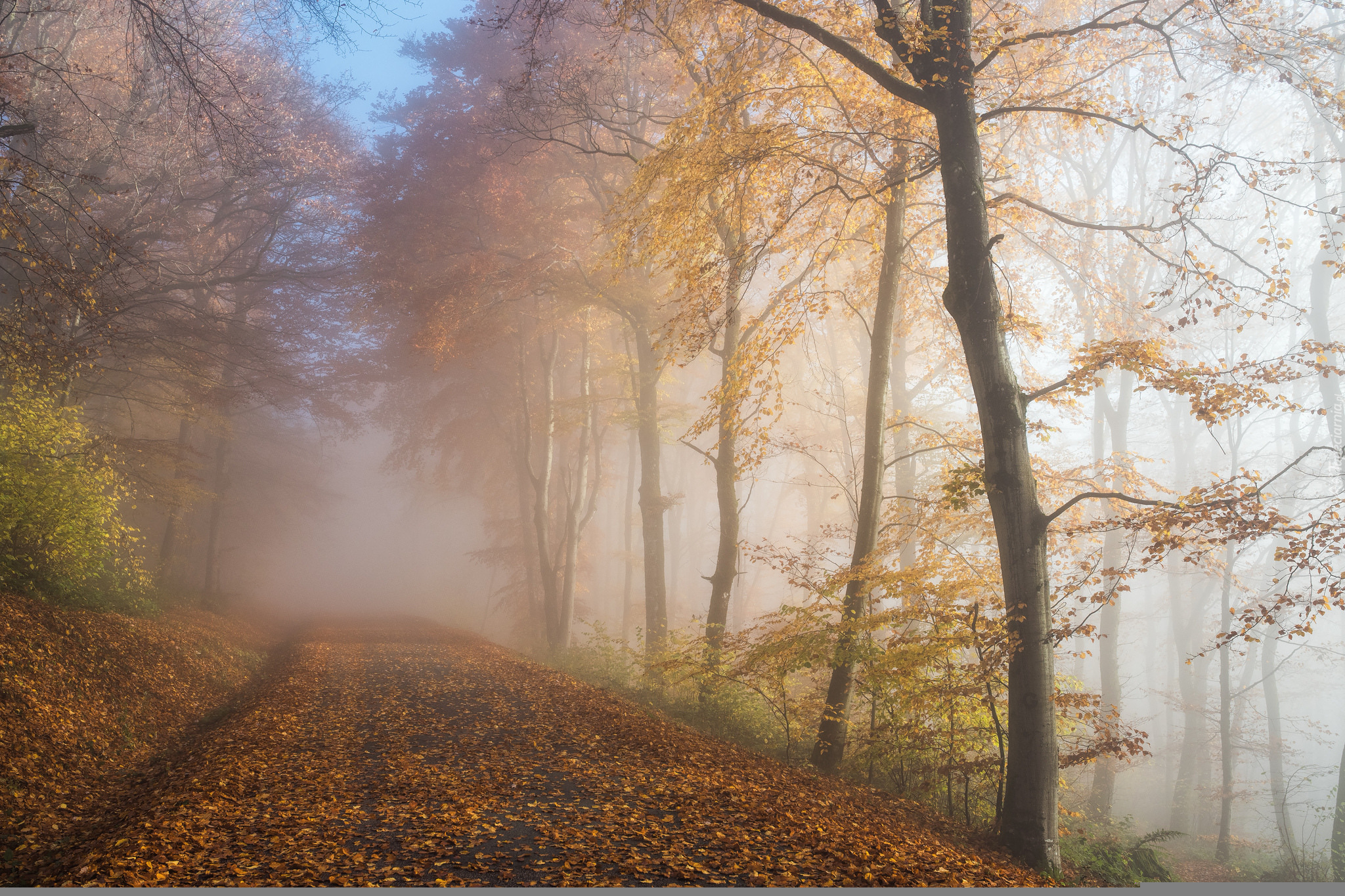 Edytor tapety: Droga w jesiennym zamglonym lesie
