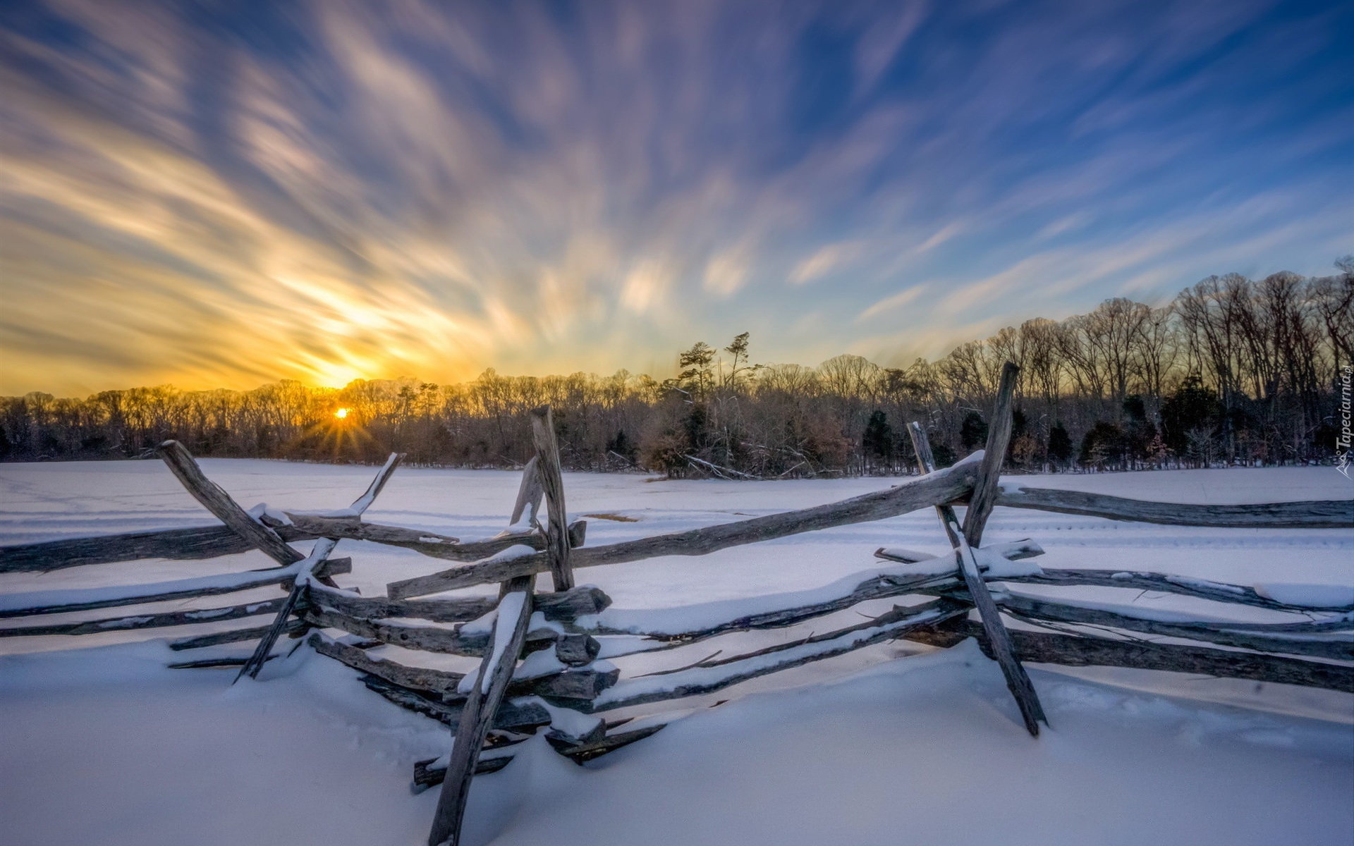 Edytor tapety: Drewniane ogrodzenie na ośnieżonym polu w zachodzącym słońcu