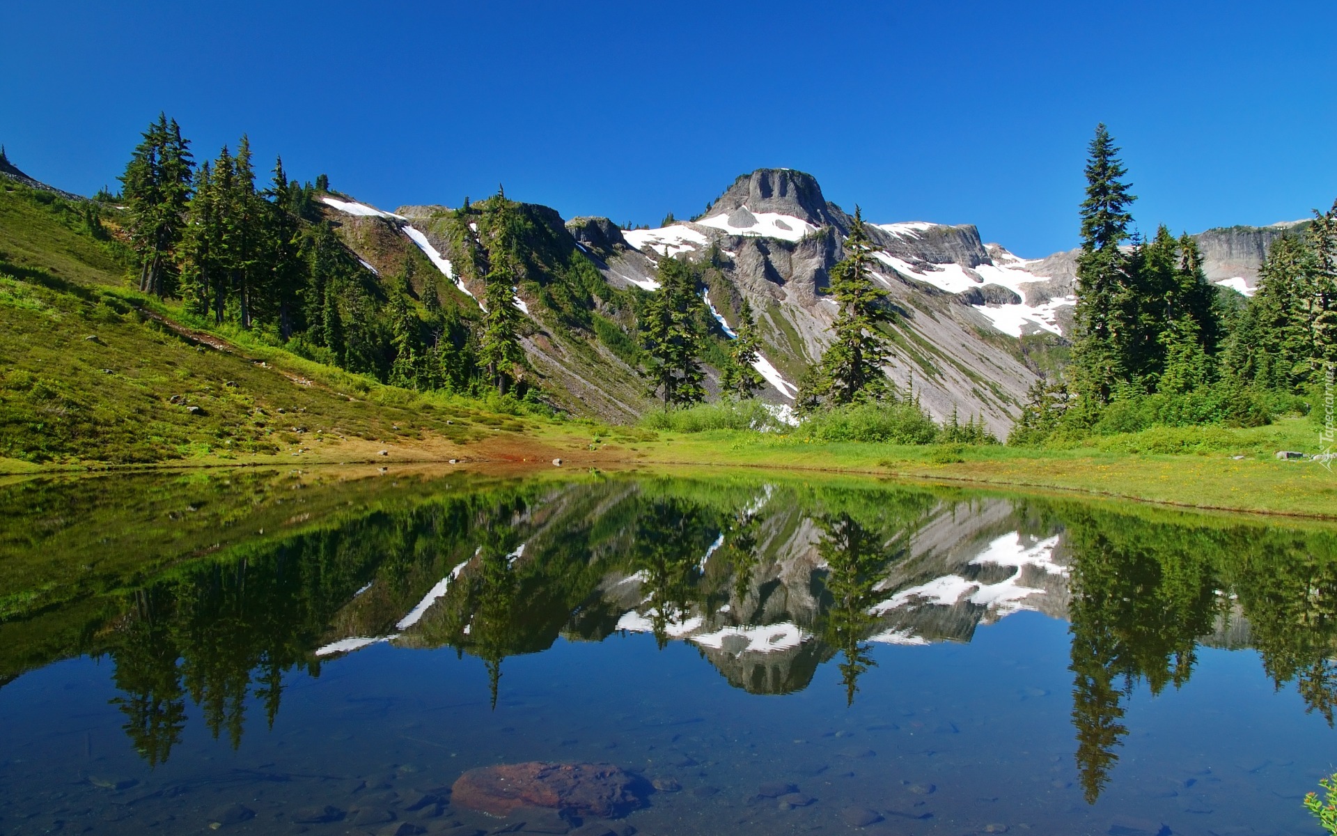 Edytor tapety: Góry i drzewa w lustrzanym odbiciu jeziora