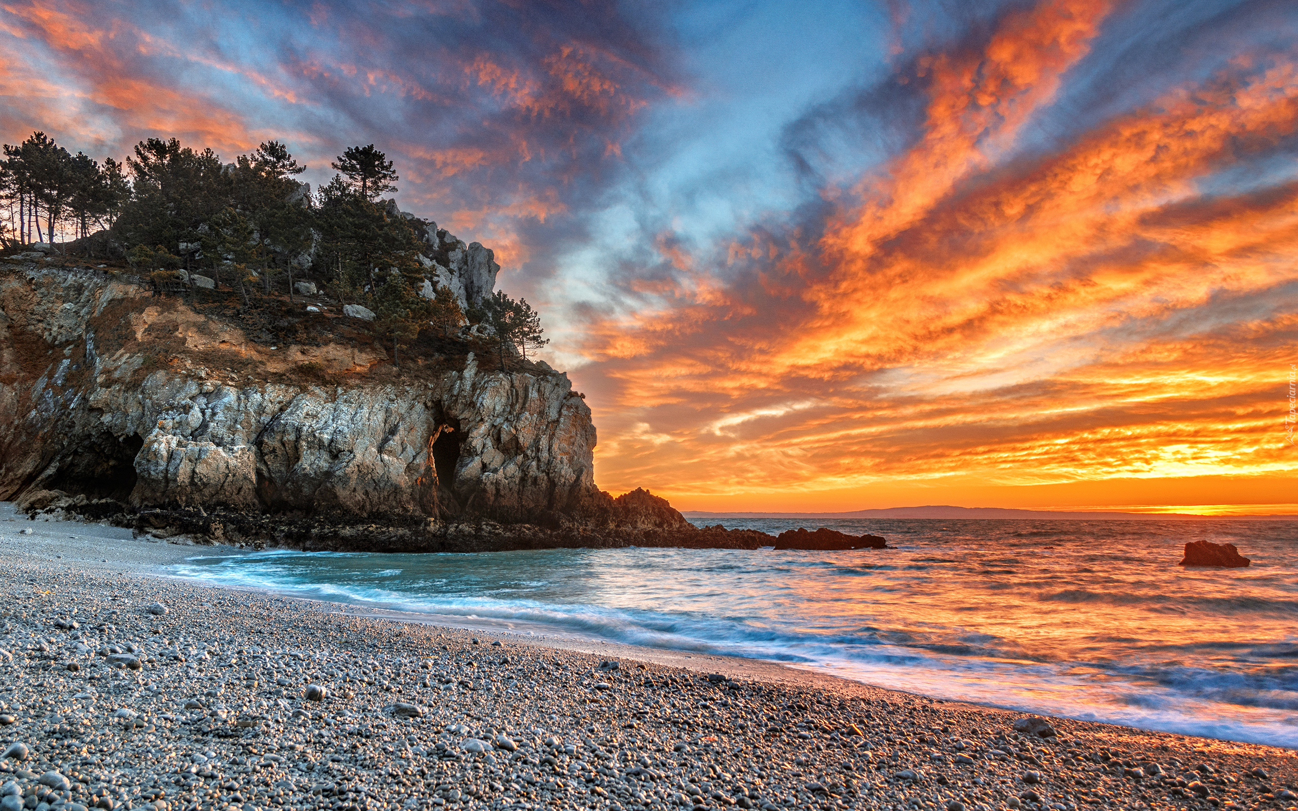 Edytor tapety: Skały przy morskiej plaży w zachodzącym słońcu