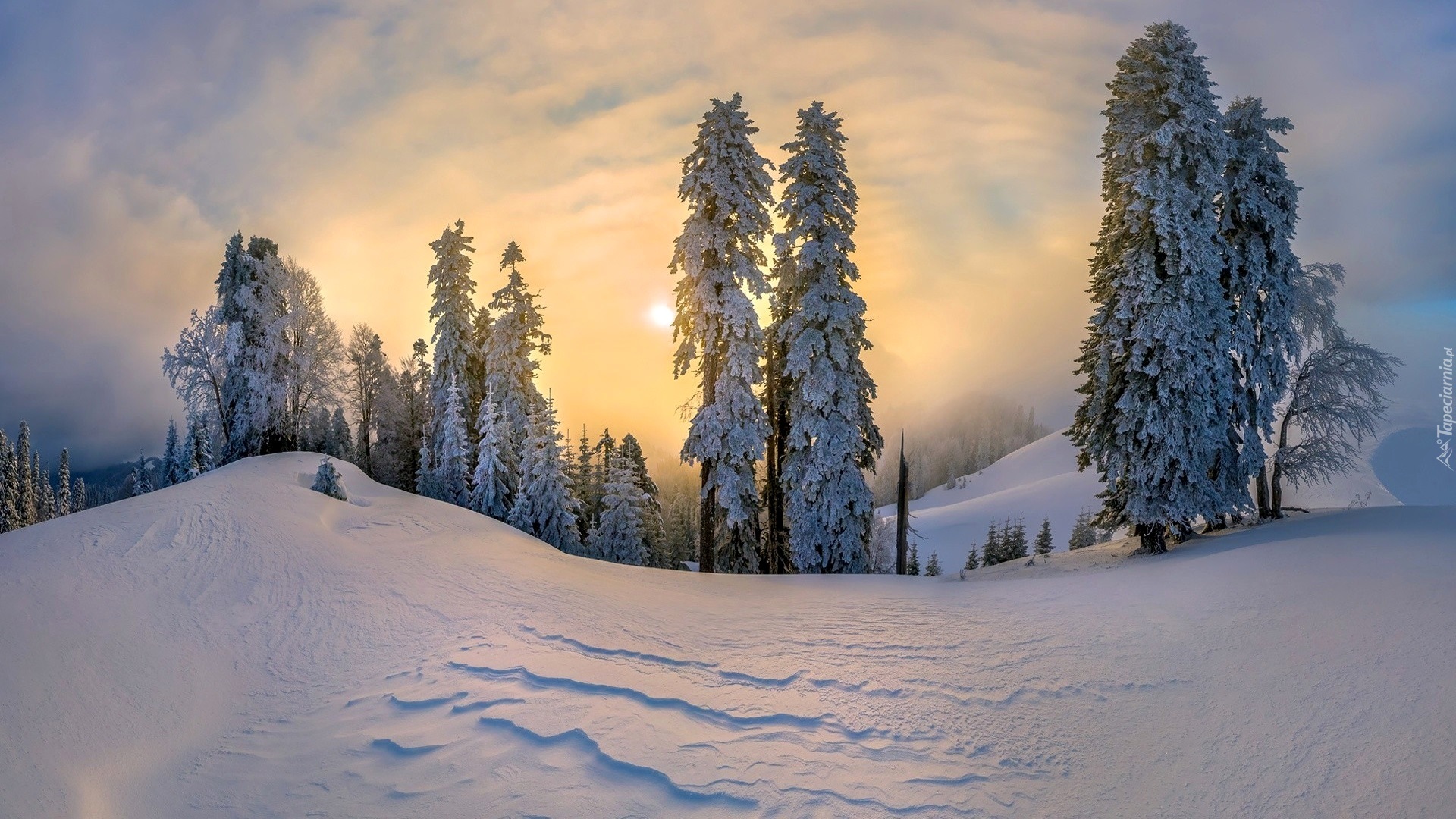 Edytor tapety: Ośnieżone drzewa na zimowym wzgórzu o świcie