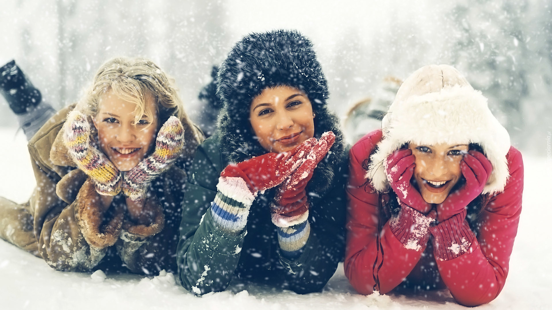 Edytor tapety: Trzy szczęśliwe kobiety w prószącym śniegu
